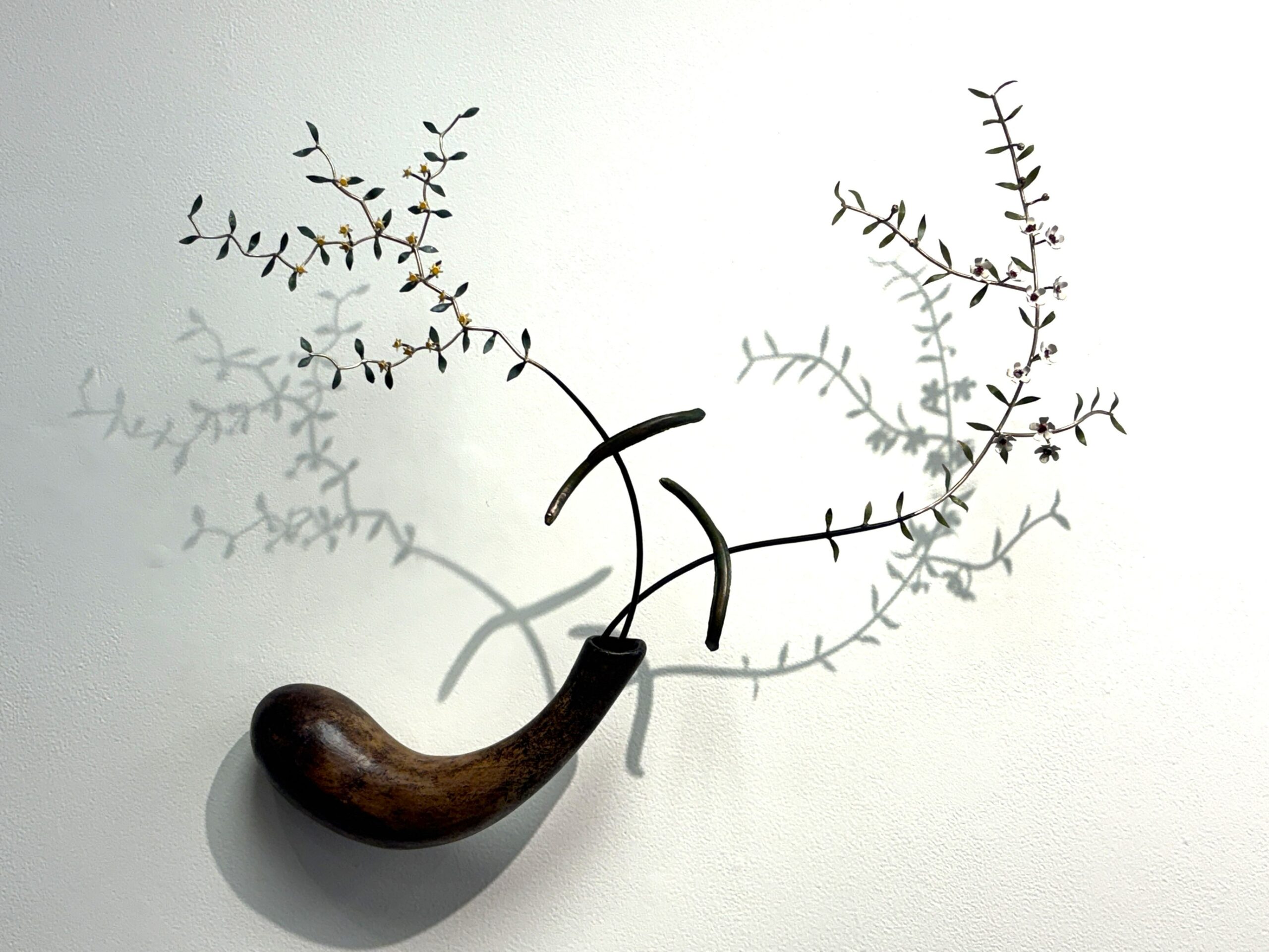 His Galaxiidae series features the tiny fish also known as ‘stargazers’, hence the constellations in the hemispheres and circles of the sculptures. These kokopu include those harvested young as whitebait, vulnerable particularly to degrading water quality in our rivers and dramatically reduced flows caused by irrigation and electricity generation. Wickedly curved steel wires imply a threat, whether direct (hunting, traps) or indirectly (the wires of electricity generation for instance). He lays down a challenge regarding their presence and impending absence in the positive sculpture vs negative space in these beautiful elegant works.