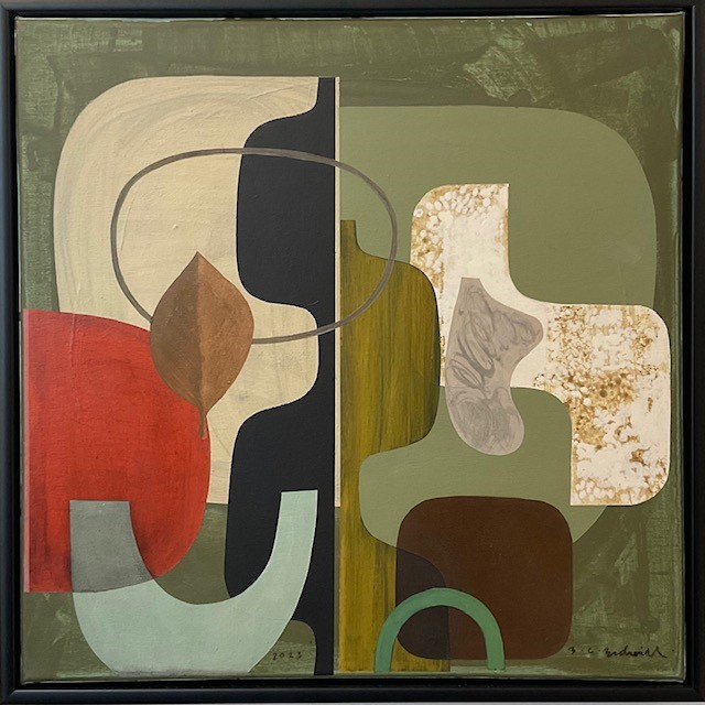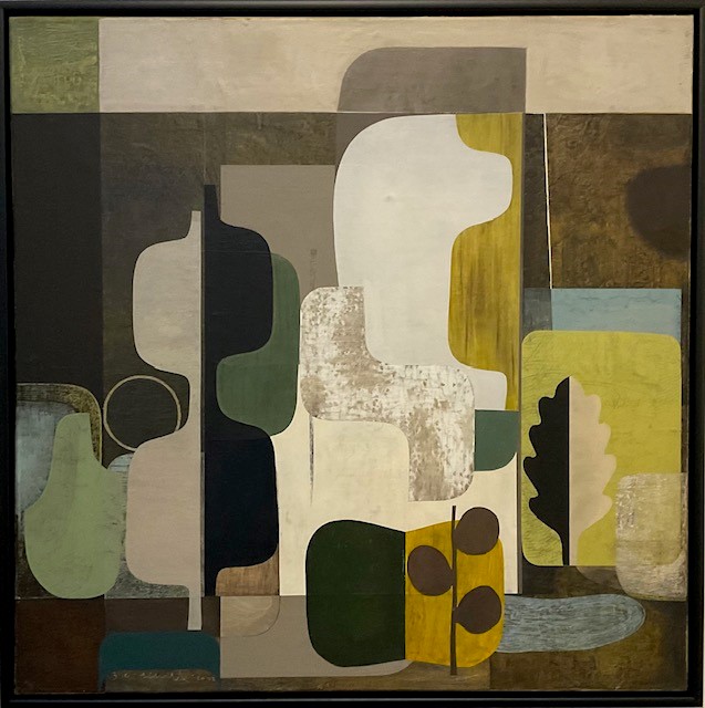 Bidwill’s recent work has an increasing use of texture either through painting onto layered or collaged canvas or onto textured wood panels, as well as using more thickly applied paint to create variations in surface. The vessels and forms float within the space, but sometimes reveal the layers of work which lie beneath.