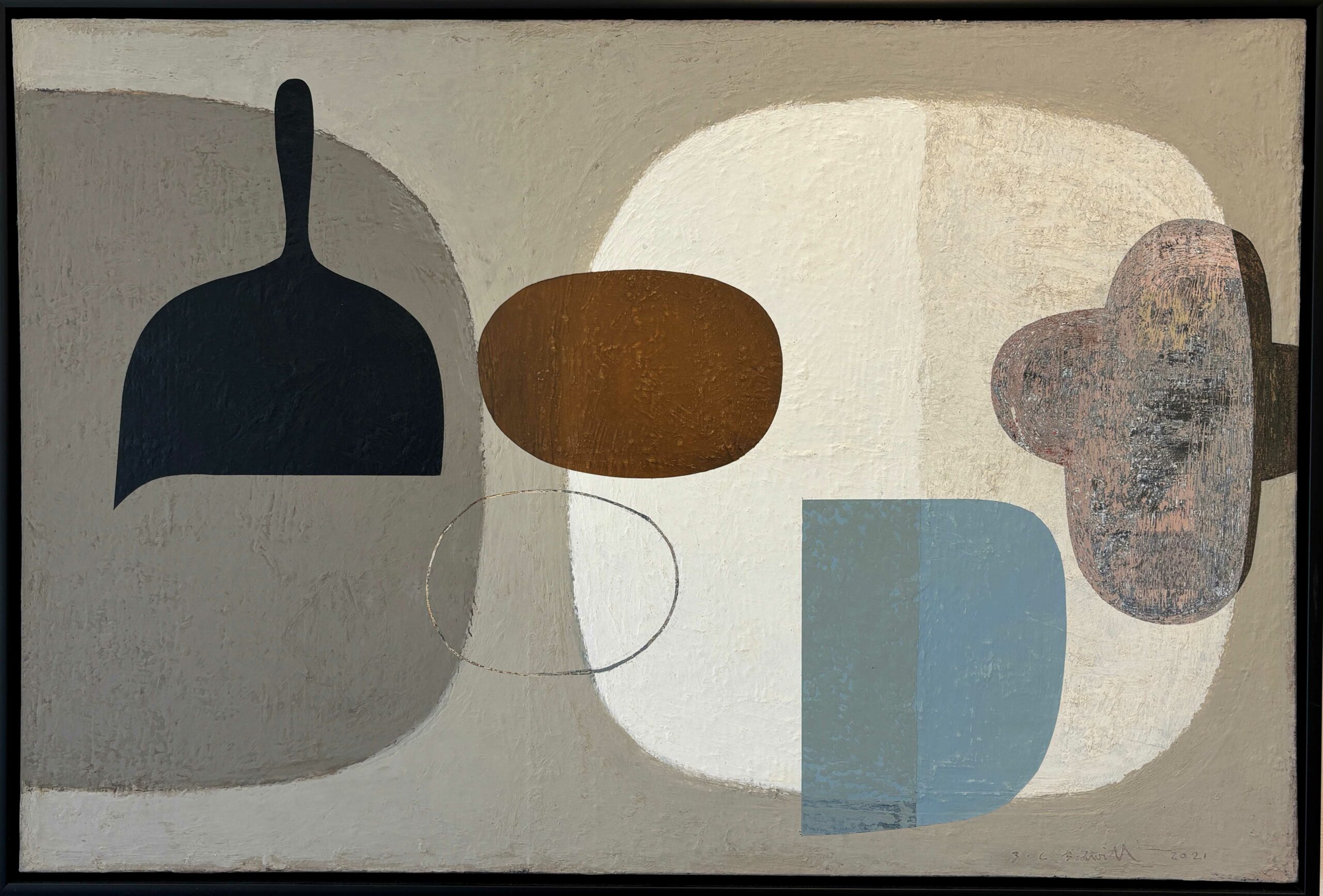 Bridget Bidwill uses subtle tonal contrasts to create a sense of atmosphere and space in works which are abstract but suggestive of elements of reality. She uses freeform shapes such as vessels, bottles, leaves, ovals, which suggest ‘still life’ but are intended to create a meditative space that evokes feeling and thought.