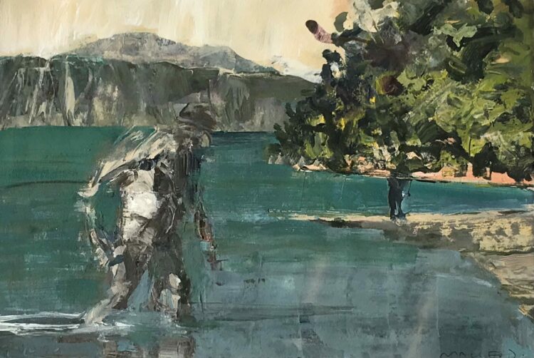 Born in New Zealand, Euan Macleod moved from Christchurch to Australia in the early 1980s, and has come to be regarded as one of the foremost painters working across both countries. His paintings often feature a dominant figure striding through or laying atop a powerful expressive evocation of landscape; moody, reflective, often with a sense of history or the past pushing through into the present. Often the figure appears to be walking through cultural history, mythological perhaps.