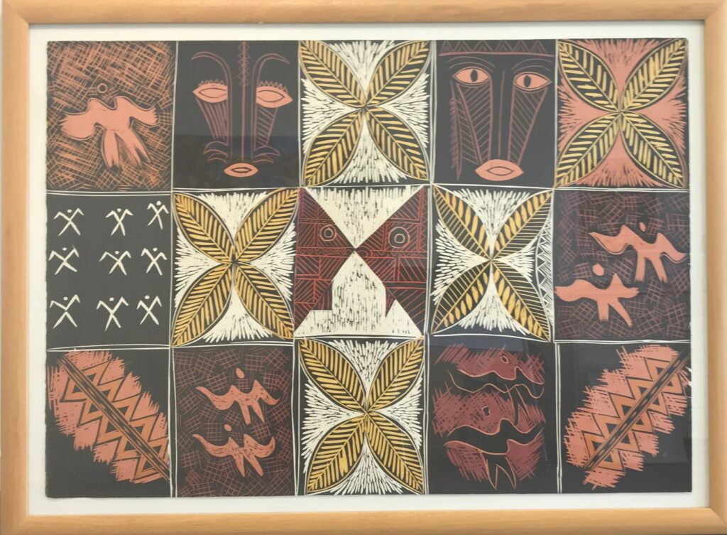The Tapui works, unique handpainted woodcuts on heavy paper, carry a powerful central motif of tapu areas ‘protected’ by squares with a cross through them, with suggestions of sails and traditional motifs in the background. The sails are sometimes faintly defined, implying spiritual guardians of the ocean resources. Tapui effectively means a protection over a place or object of major significance.