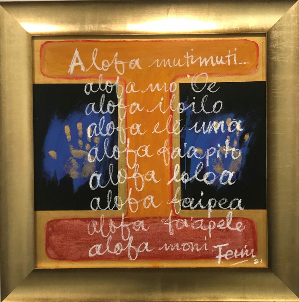Over the past decade, Fatu Feu’u has developed a series of works based on the Samoan tradition of ‘ifoga’ or reconciliation/rebuilding after a terrible event or action. The central letter ‘I’ as a motif captures this, with different colours coming together, meeting half way. This can be a meeting between families, tribes, villages or even nations, often to reconcile after someone has wronged another person or party.