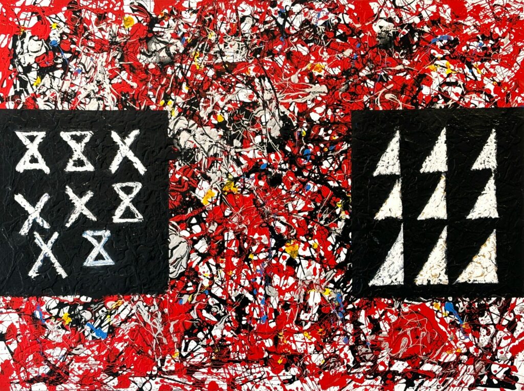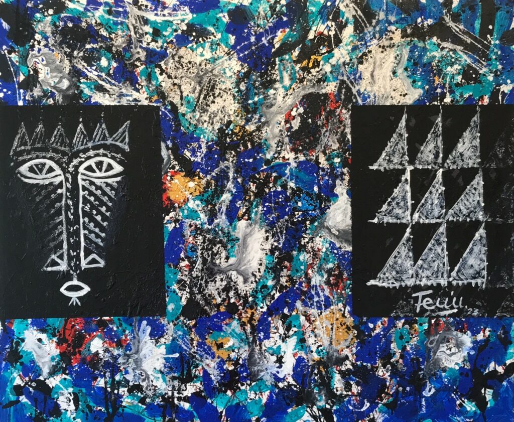 A new series of significant paintings meld traditional Feu’u motifs such as atua, long-nosed god, and symbols of voyaging, with his recent expressive abstract technique, creating an overlay relating to issues of conservation and sustainability and impact of climate change on the Pacific.