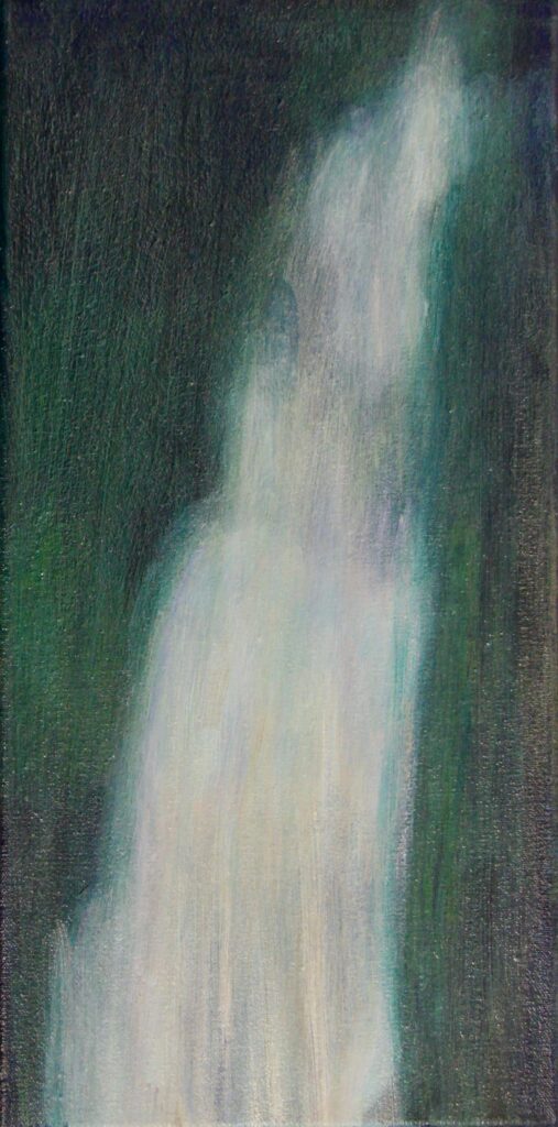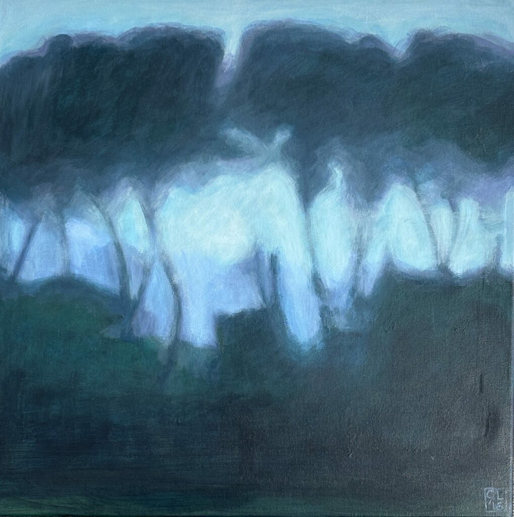 The slightly earlier Kanuka series were inspired by stands of trees holding to the edge of the riverbank near Foxton, underpinned by knowledge such as the response of trees to environmental degradation: limited sequestration of carbon dioxide, for instance. Her paintings are seductive, but the message may have an edge.