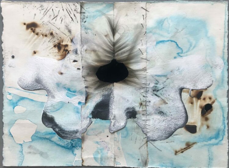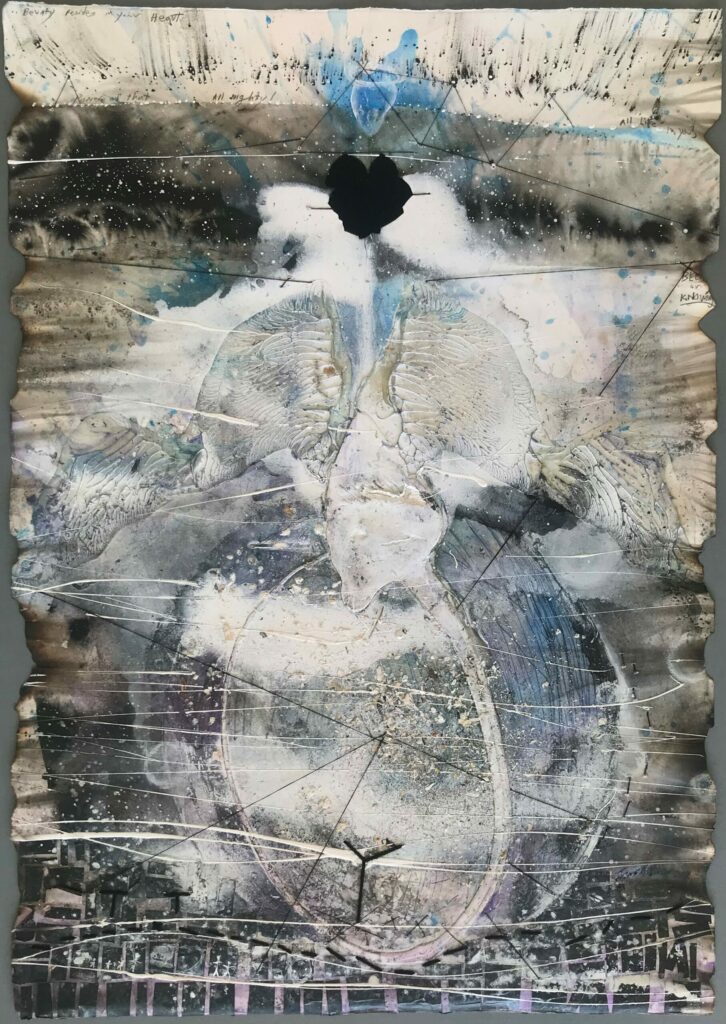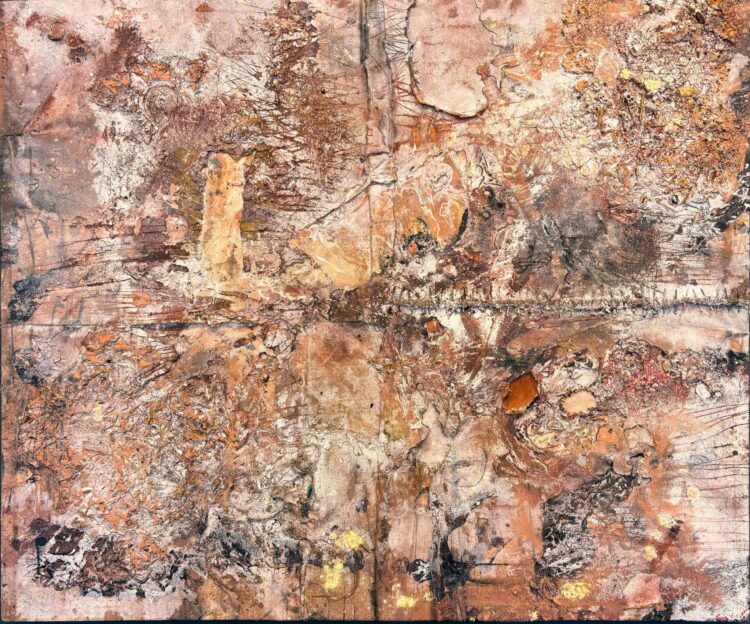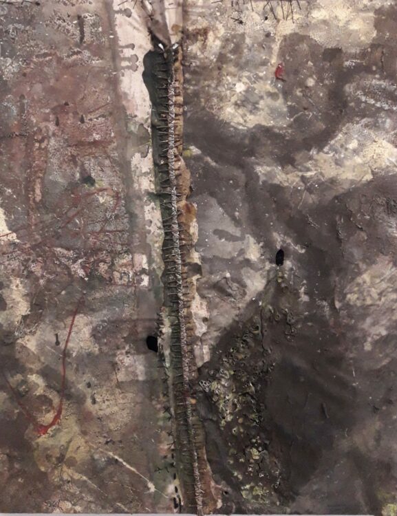 His materials are diverse – discarded domestic objects, along with stones, shells, fabric, and often the sharp edge of nails and wood. Areas are slashed through then stitched to hold just barely together, are burned around the edges, or have voids of blackest velvet. Fragments of earlier paintings are melded together, stacked into a structure that, like human endeavour, might make sense of it all.