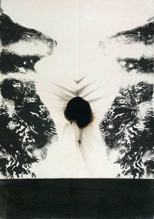 The titles are often open to as many interpretations as Robinson’s works themselves. There’s a sense of forces beyond our reckoning, wrestling on and under the surface of the canvas. And underpinning all that, is Robinson’s use of art as ‘social and cultural work’, laying bare our engagement (or not) with each other and with the planet, and the fact we are at a critical pivot point for our civilisation, species and consciousness. ‘Internal processing is not common in art now,’ he observes, ‘but I can only relay what I perceive to be going on.’