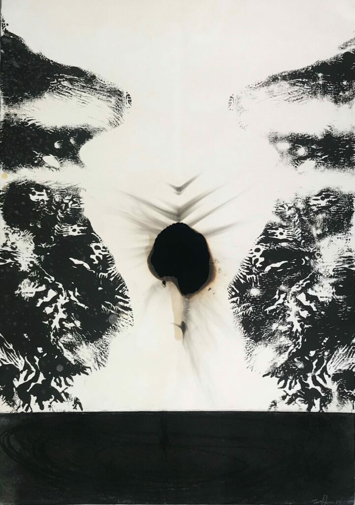 It’s difficult to describe works that indeed are best ‘felt and heard’ first hand – distinctive, visceral, with an internal energy that seems ready to burst through the canvas or rip apart the stitching at any moment; defying definition. He collages diverse materials and strips of canvas, with tiny symbols and cartoonish drawings to be discovered amidst vast abstract gestures – a clue to his own questioning of consciousness, or our relationship with the planet and the universe.