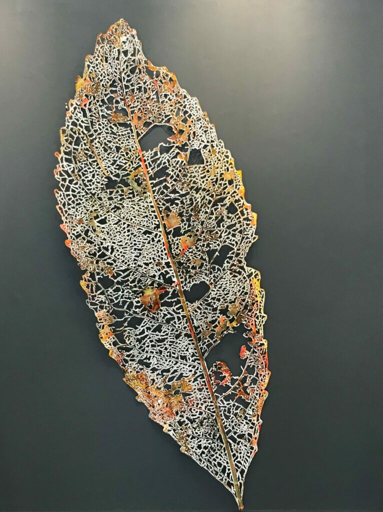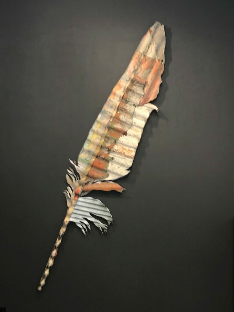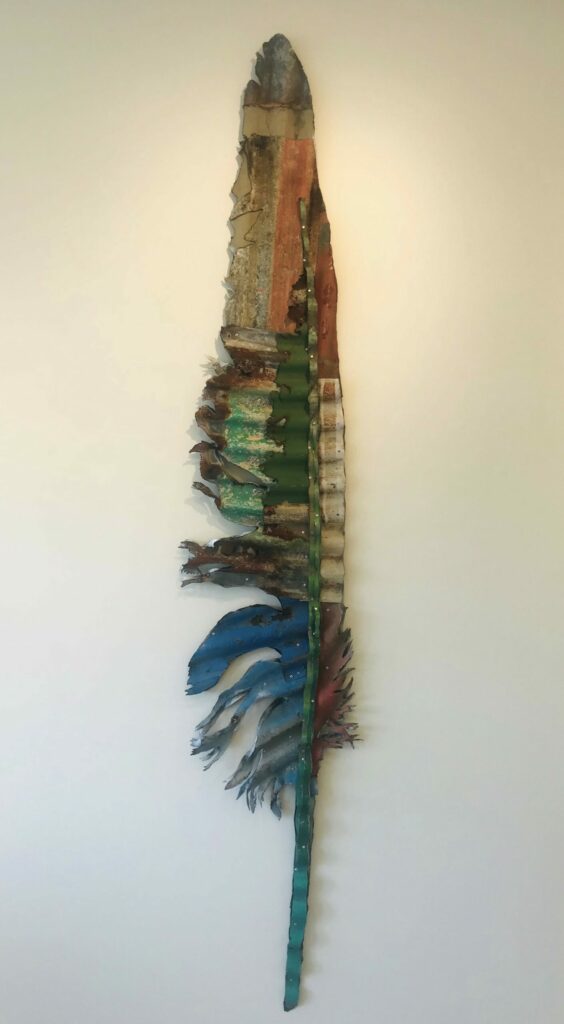 The Feather series has an enduring following, each one individually crafted from used iron, with its own unique personality. Larger than human scale, these are usually 2-3 metres from tip to quill, made of layered corrugated iron, and range from beachy to fiercely coloured works, some transformed through fire.