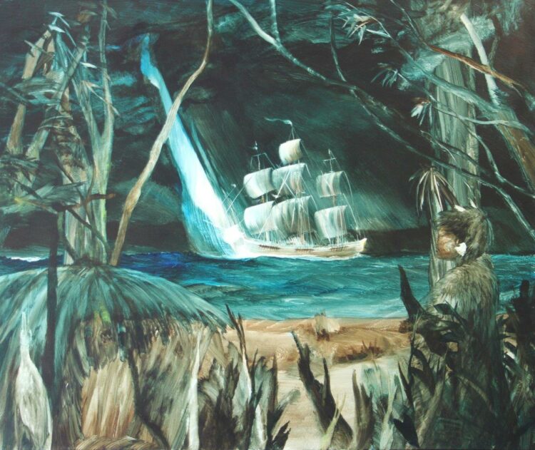 Born 1954 in Tolaga Bay, John Walsh is of Aitanga a Hauiti and New Zealand Irish descent. Although largely self-taught, he studied art at Ilam, Canterbury University in 1973-74. After many years primarily exhibiting around his home region of Gisborne and Eastland, John Walsh had his first major solo exhibition when he was nearly 40 years old, and quickly established a reputation for a mythical realism, founded in the landscape but often featuring mythological figures questing within, moving through or above the land. Walsh rose quickly to prominence, with works on an increasingly large scale. Often his works are in response to contemporary incidents, with a subtle thread of underlying humour, or more serious issues to do with human connection with the land, also influenced by Maori mythology, incorporating ancestral and legendary figures.