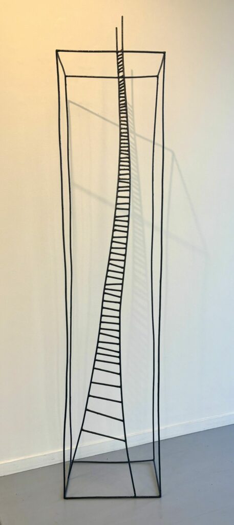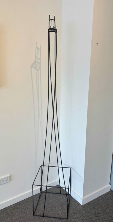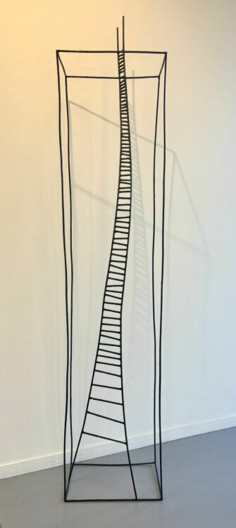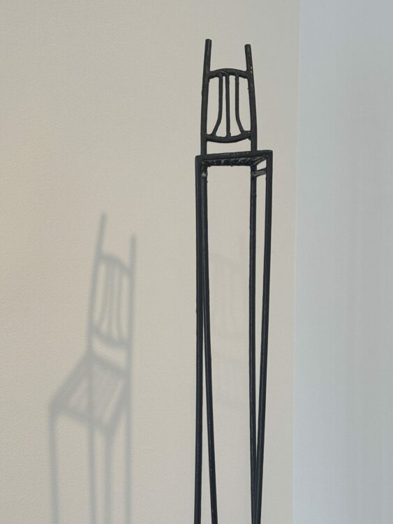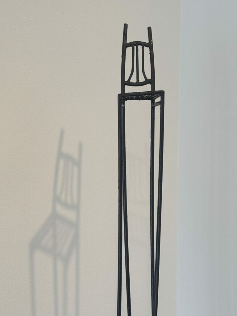 His recent works also include elongated structures using wire or steel rods, with a rising chair or ladder carrying their own philosophy – such as The Absentee, a surrealist homage to someone who has passed on, no longer here but their memory still present.