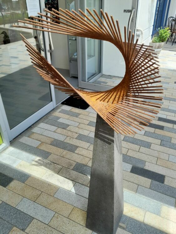 His mesmerising wave and wing works are created from 60cm steel rods, hand welded into a form mounted on a dark concrete plinth, turning in the breeze.