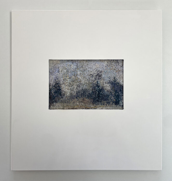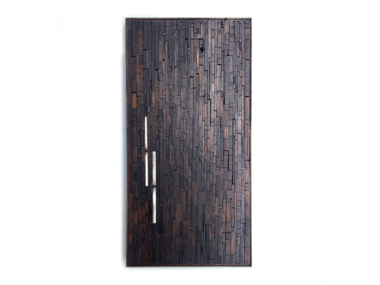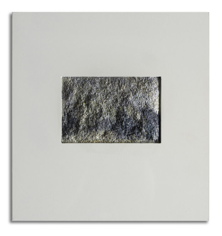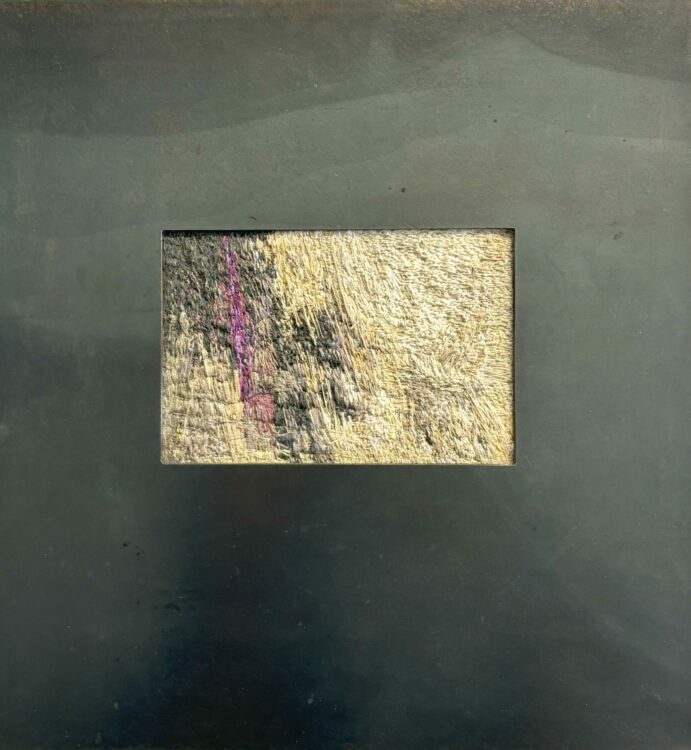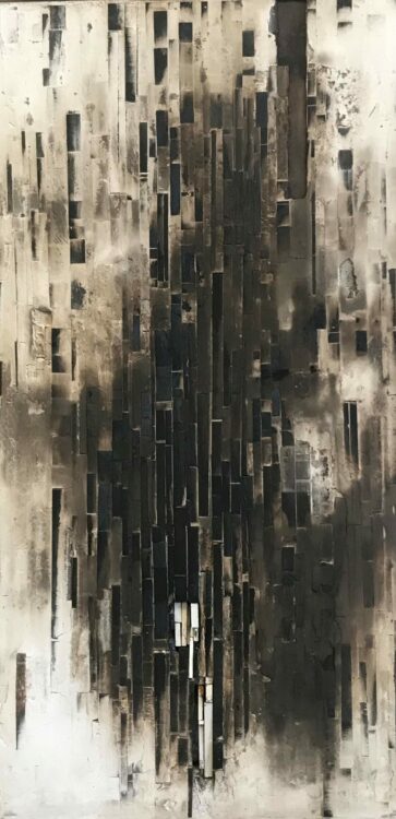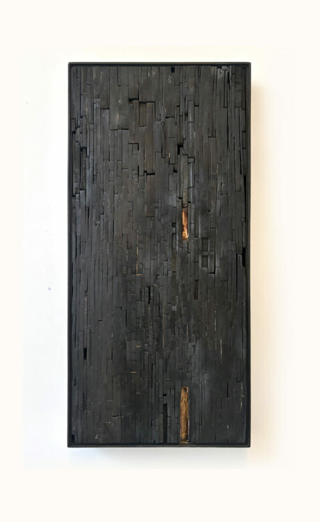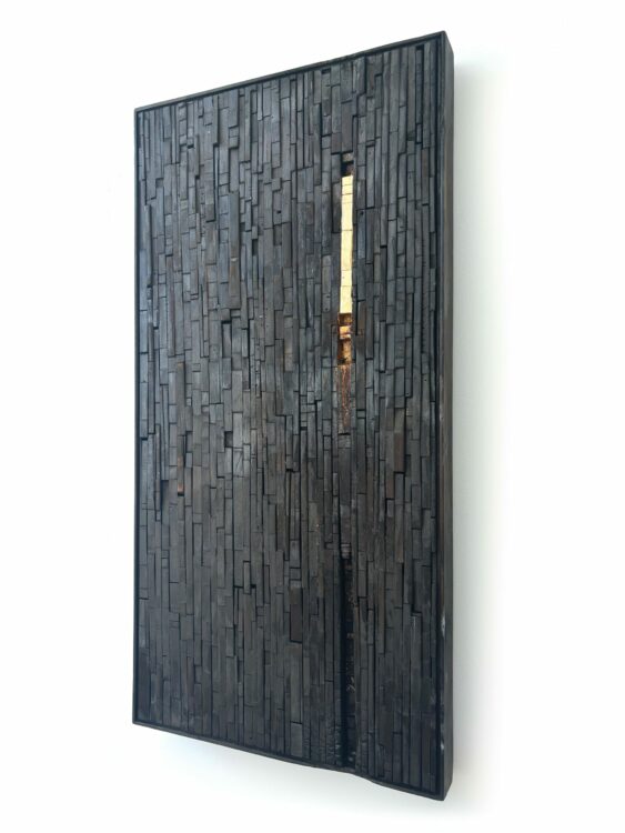 She undertook a Masters of Fine Arts (University of Canterbury) in 2022-23, and achieved Distinction on graduating. The return to study took her more intensely back into painting, diverging from her previous mosaic assemblages of found heritage wood, charred and painted. Those processes have flowed through into the new paintings, but are hidden beneath intriguing, subtle and multiple layers of acrylic paint. Just a few of these works are still available, including two at The Diversion 25 Years exhibition.