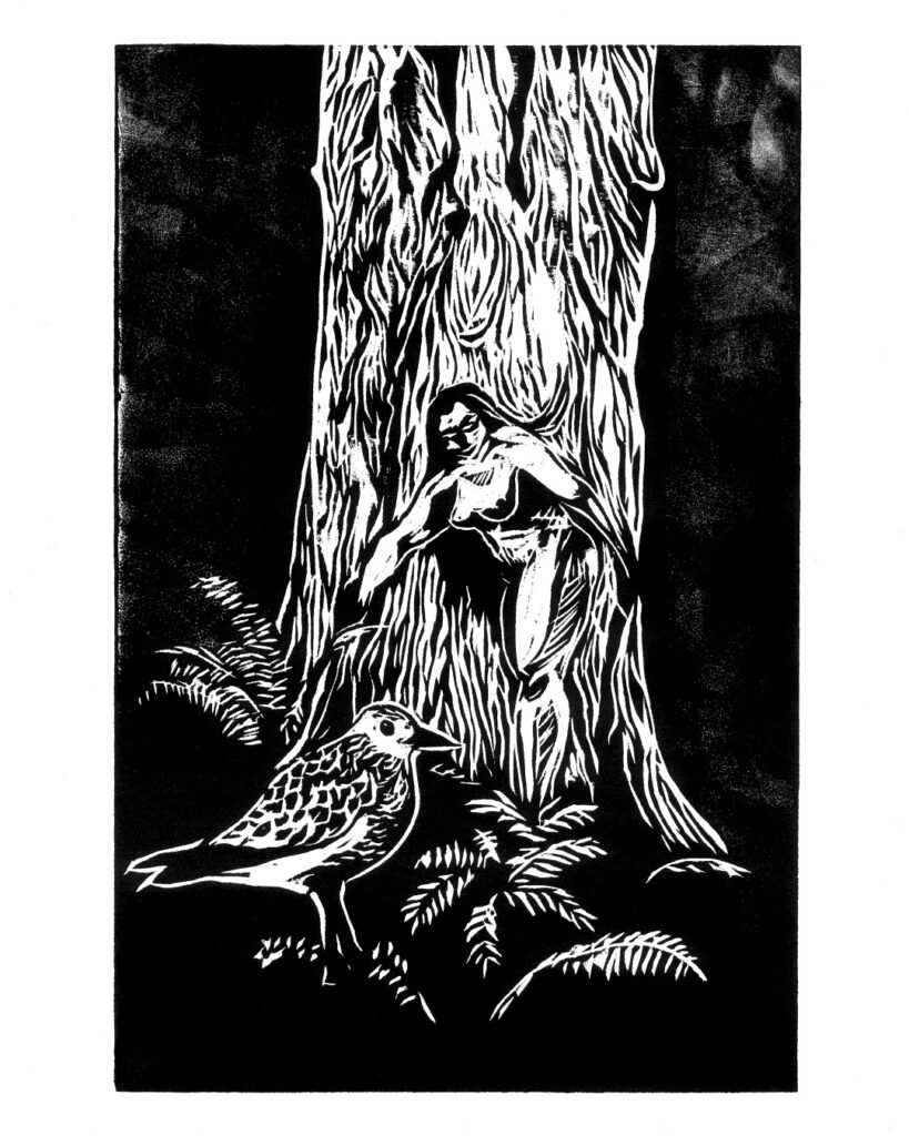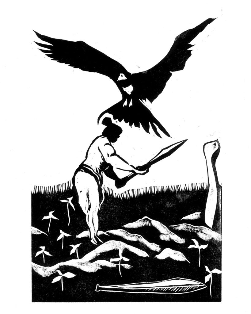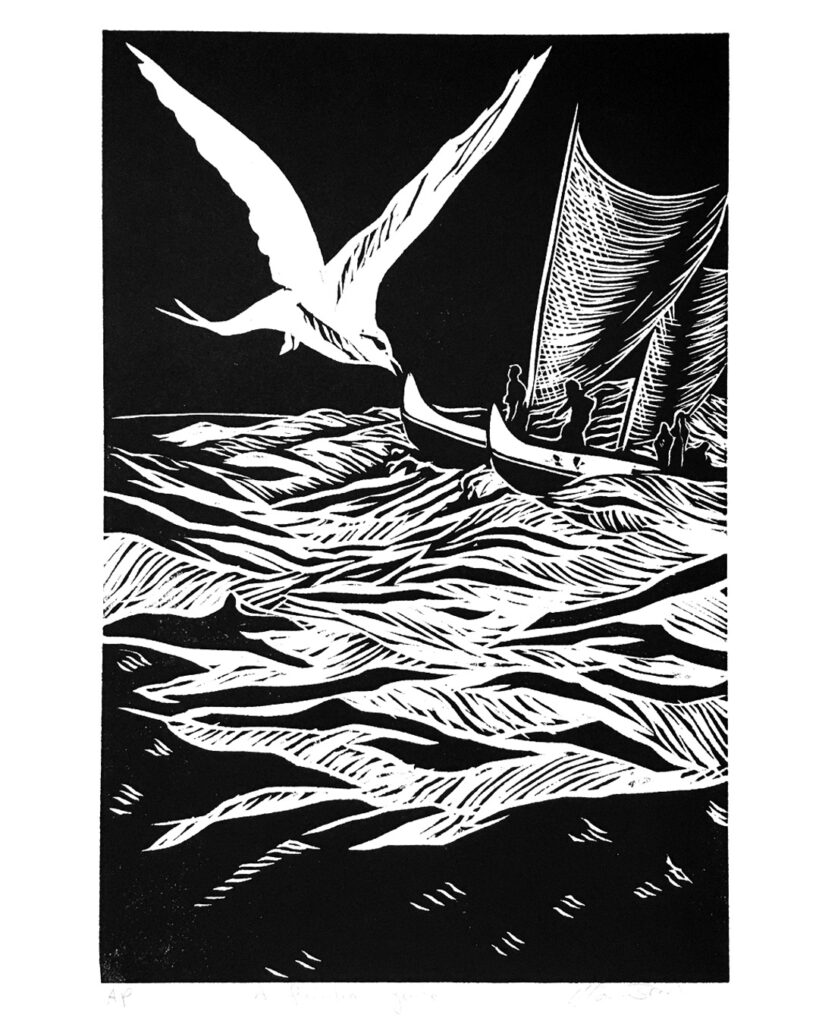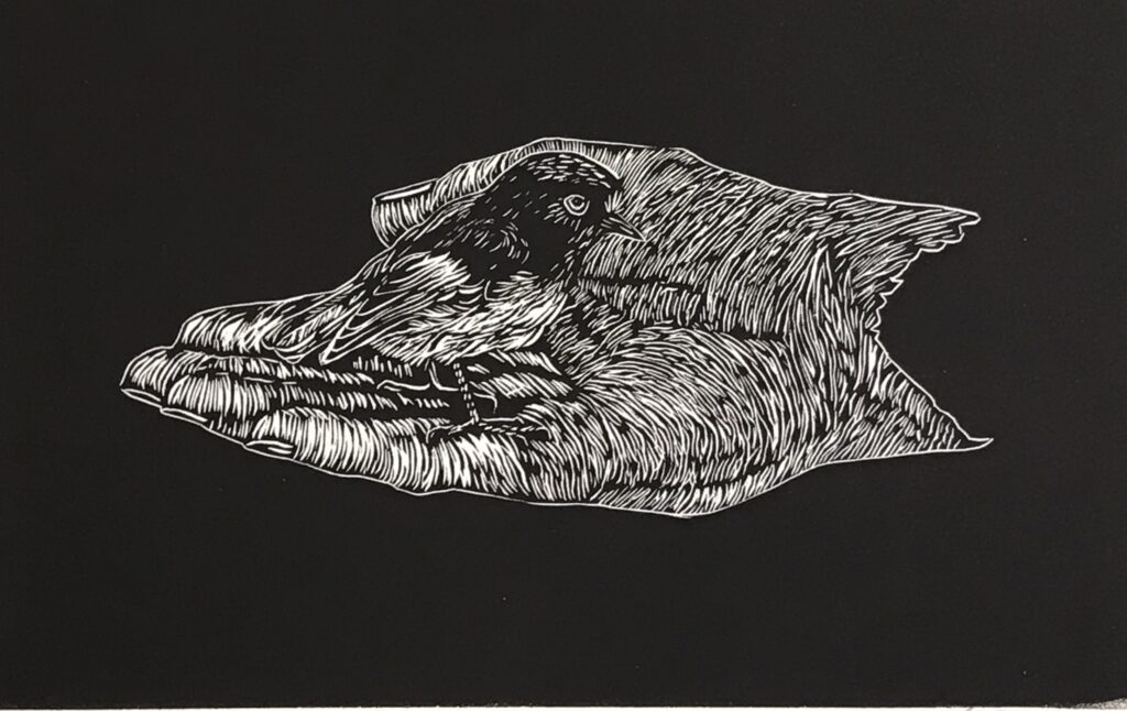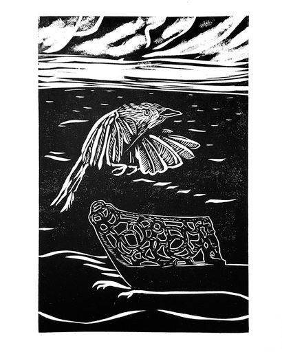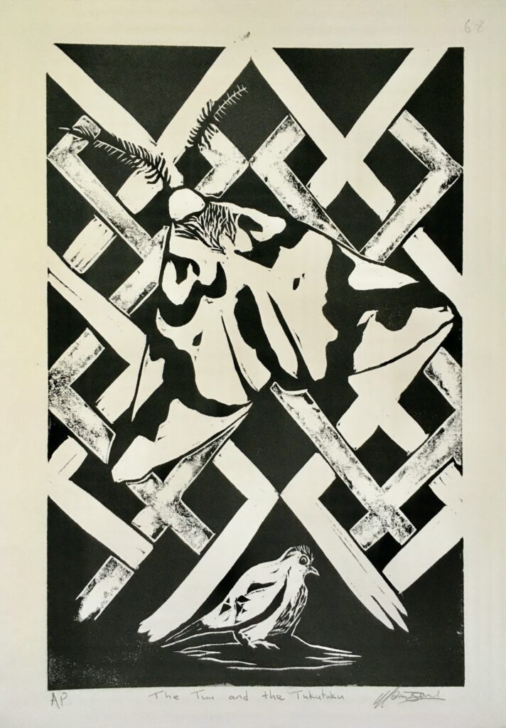 Recently he also completed a series of black and white woodcuts for hand made books presenting a selection from PhD theses on Bird Myths of Aotearoa, and Bird Myths of the Pacific, by Raphael Richter-Gravier. The full portfolio is available to view on request, some are accompanied with text of the relevant origin story behind the image.