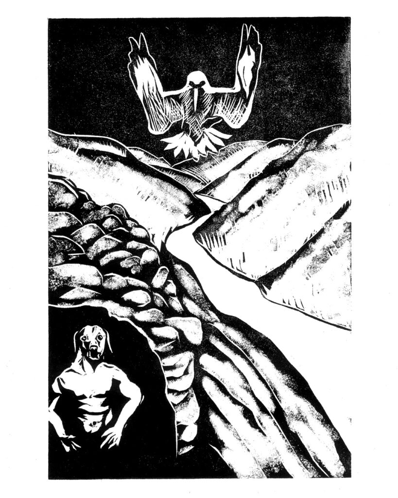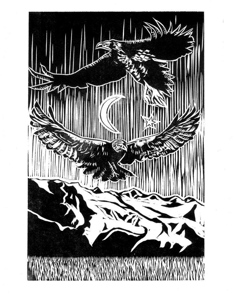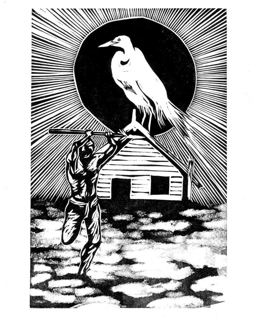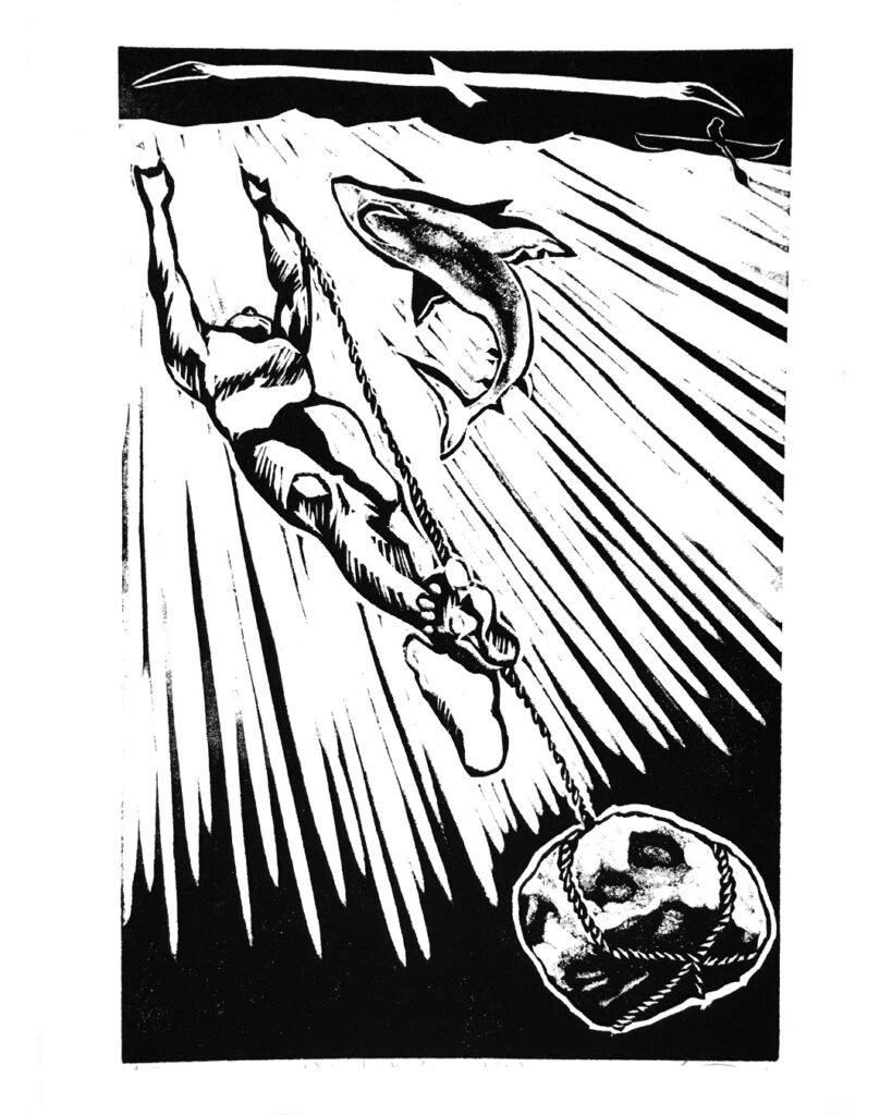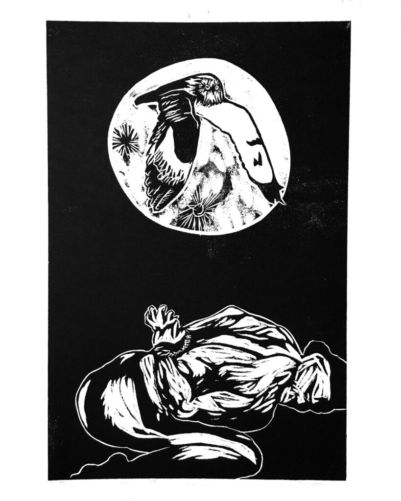 Recently he also completed a series of black and white woodcuts for hand made books presenting a selection from PhD theses on Bird Myths of Aotearoa, and Bird Myths of the Pacific, by Raphael Richter-Gravier. The full portfolio is available to view on request, some are accompanied with text of the relevant origin story behind the image.