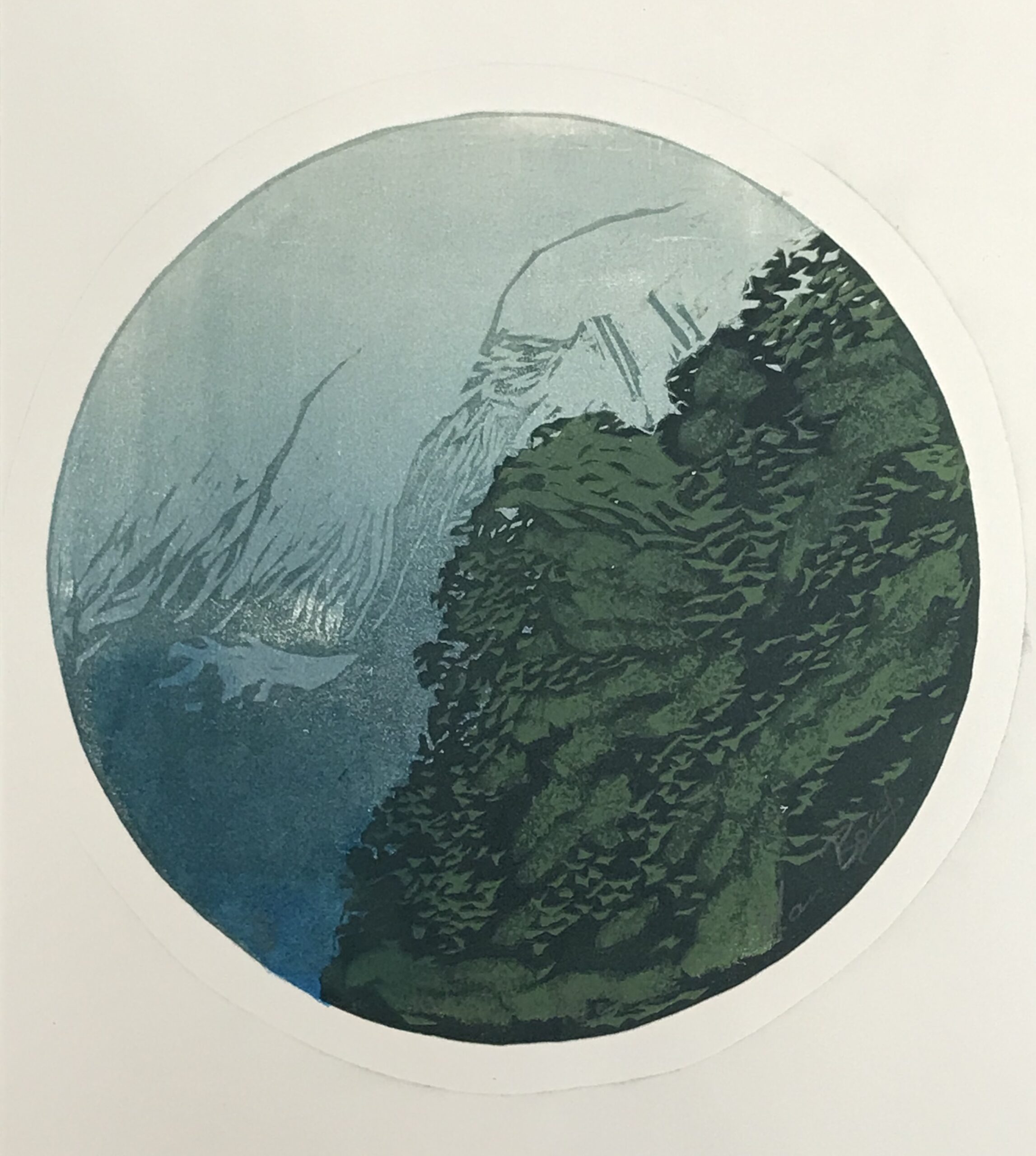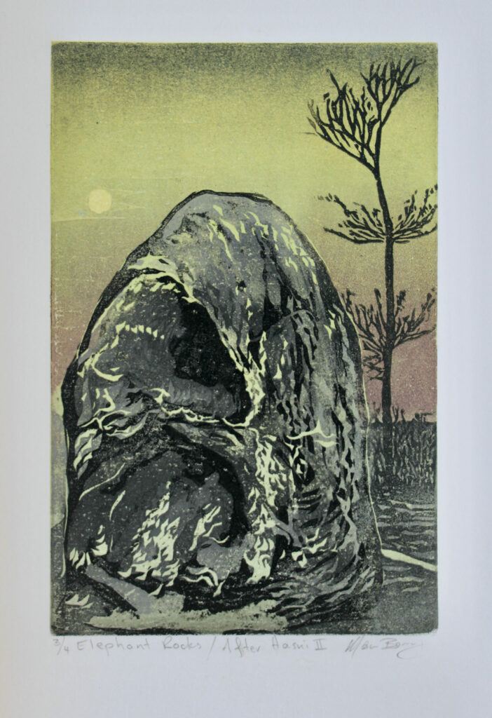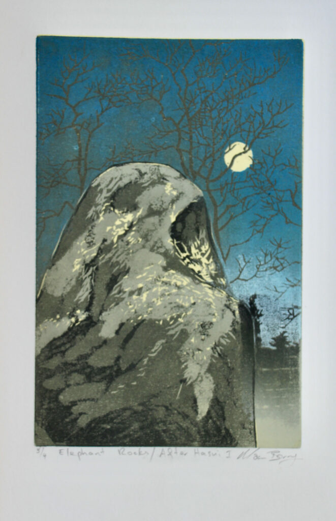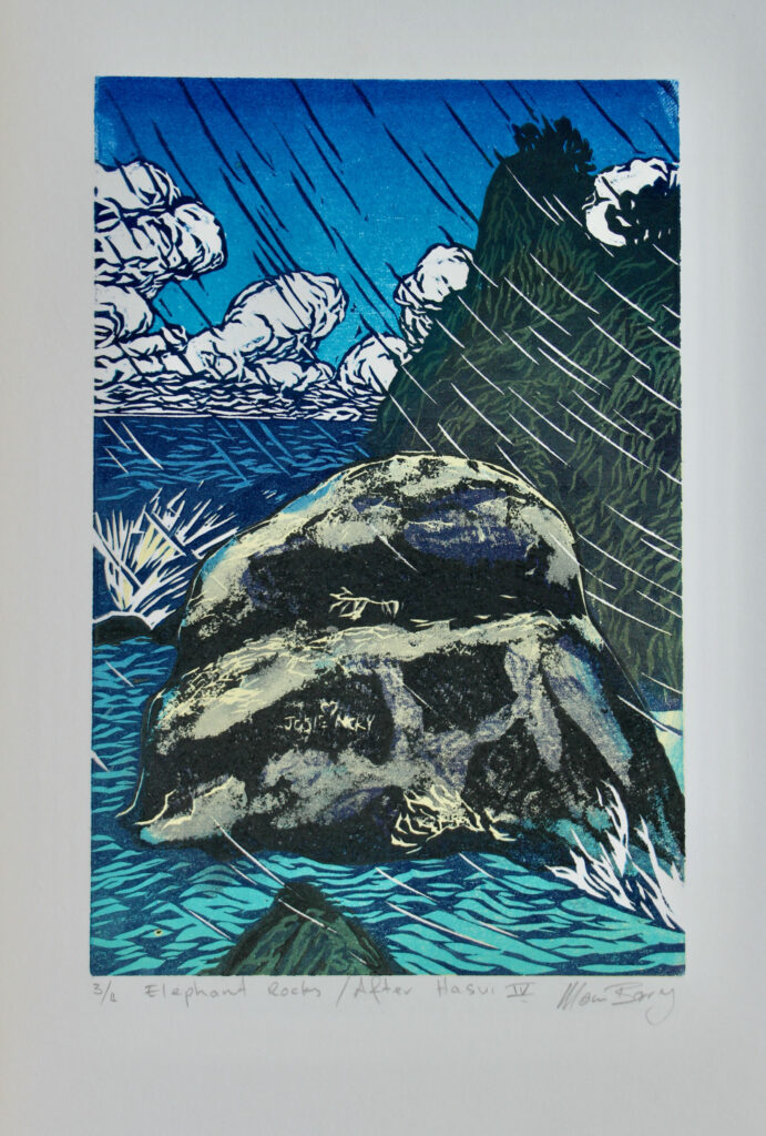 Manu Berry is sometimes inspired by the landscape, at other times by narratives and his most recent series focuses on a distinctive view of native birdlife; he is a master of creating mood in his woodcuts through swathes of colour layered as if in a painting, but without the certainty of viewing it until the print is revealed. He works in very limited editions – usually only three or five in each edition, as he likes to move on to new ideas for each exhibition. As they are very affordably priced, the prints sell out quickly (enabling the artist to move on to the next suite!). Each work has subtle variations in the level of inking as they are hand-worked.