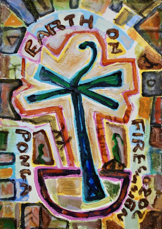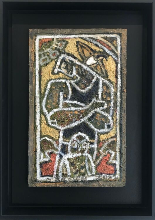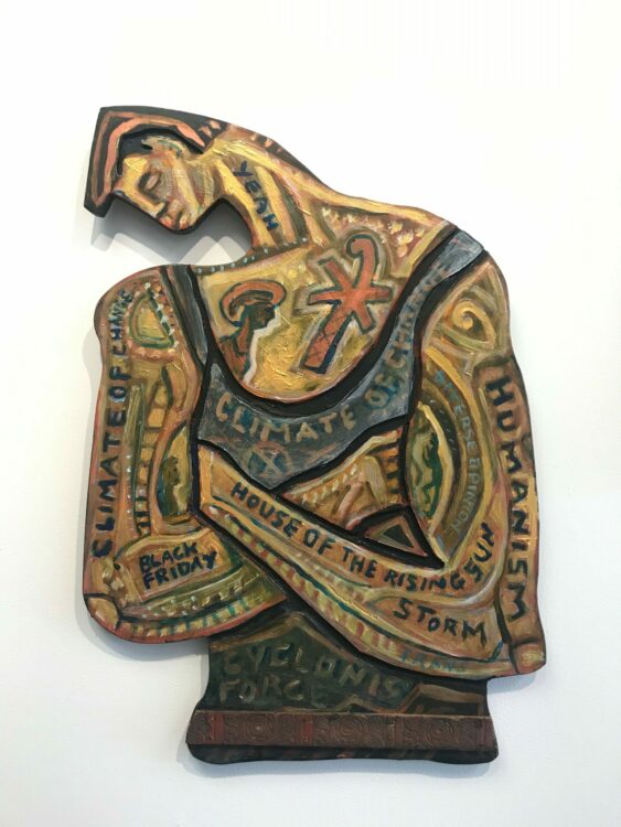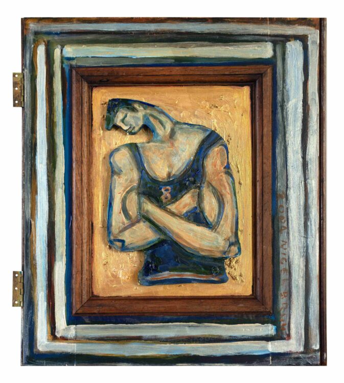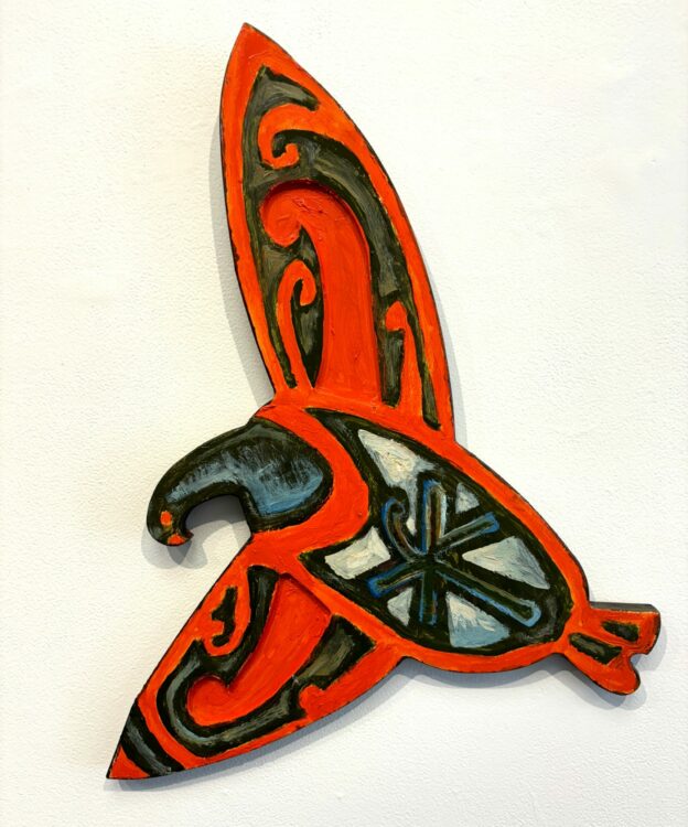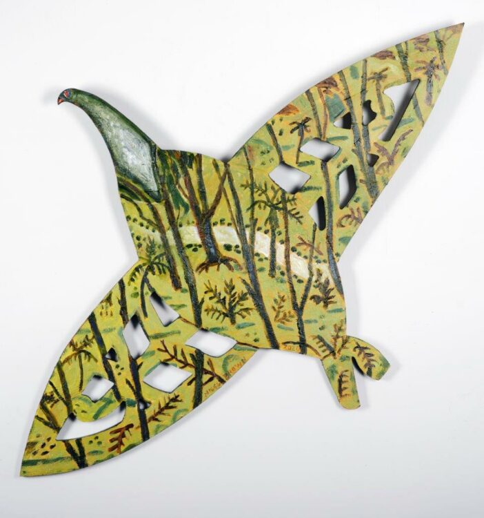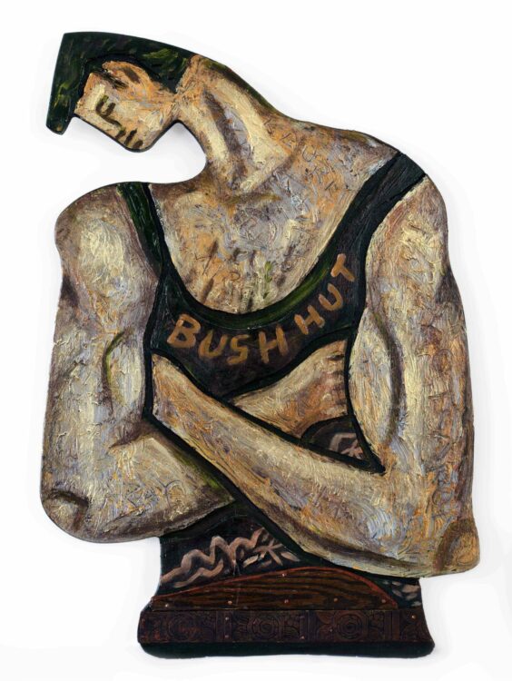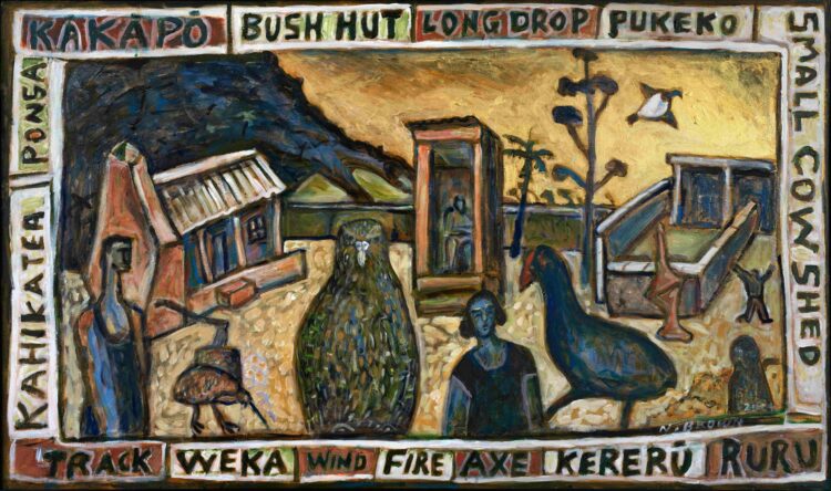 The ungainly but beautiful kererū lumber into the skies carrying hope, urging an intuitive approach. Sustainability and the need for the workers of the land (often represented by his iconic ‘black singlet’ man) to become nurturer are central to recent paintings, often with a gilt sky emphasising ‘icon’ status of certain motifs and figures, including the kererū, the ponga or tree of life, the black singlet man. Brown is also keen to escape the constraints of the ‘rectangle’ format: his painted plywood cutouts counter ‘the cool smooth slickness of our techno society with a rough homemade authenticity’. A black singlet figure remains as a kind of physical labourer needing to evolve into a nurturer. He hopefully needs to be seen as an ongoing painting device or a vehicle for the subconscious rather than as a number eight wire anachronism stuck in the past. Only viewed in this way can he measure up to the challenges facing the planet…