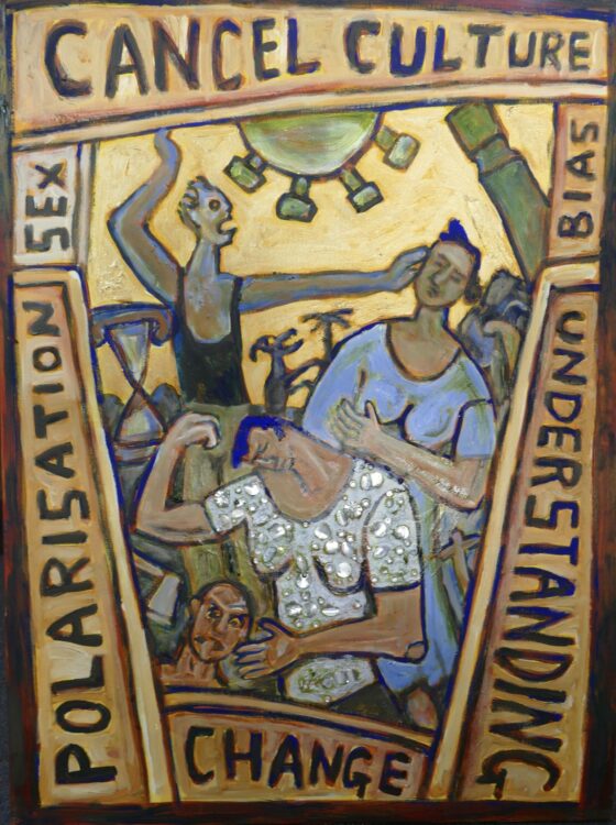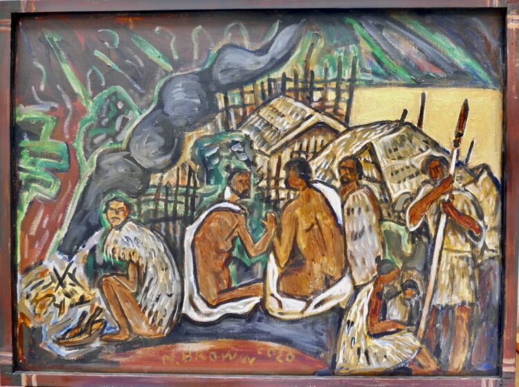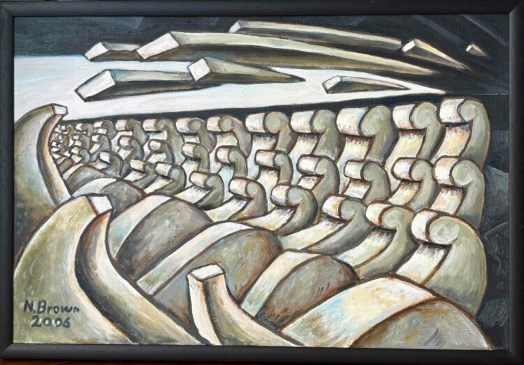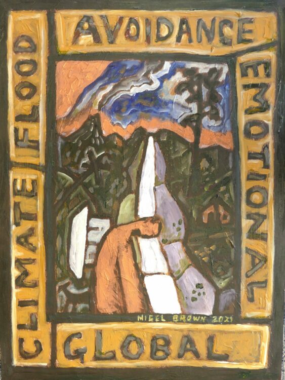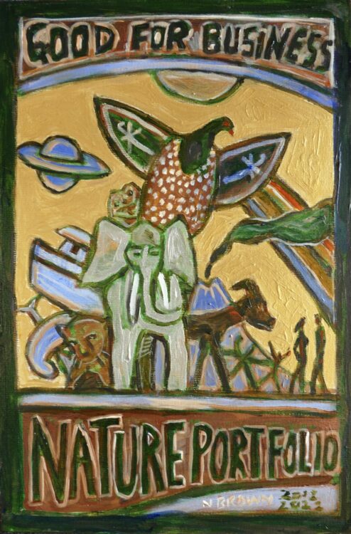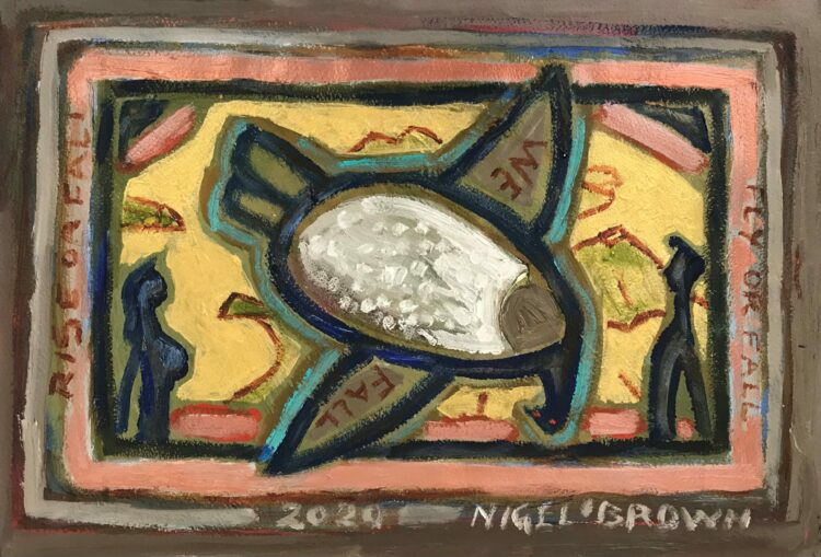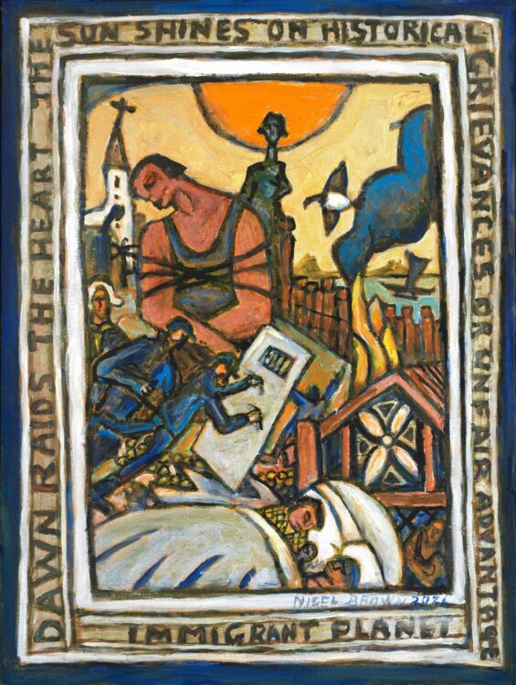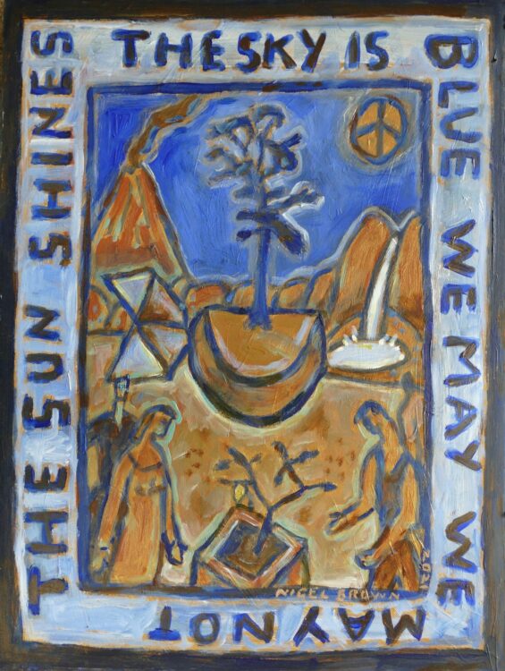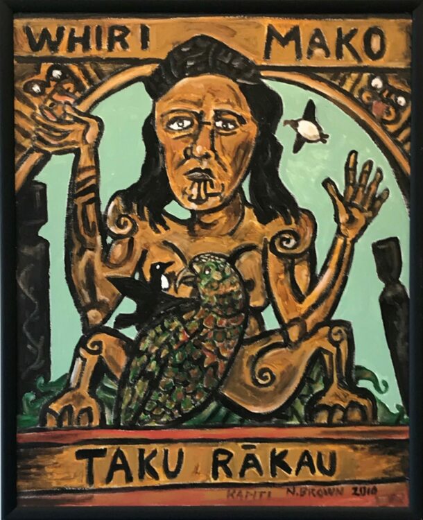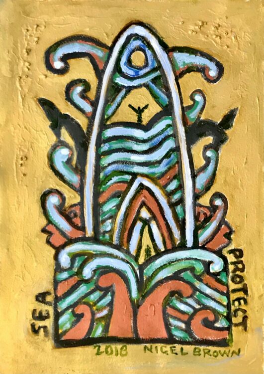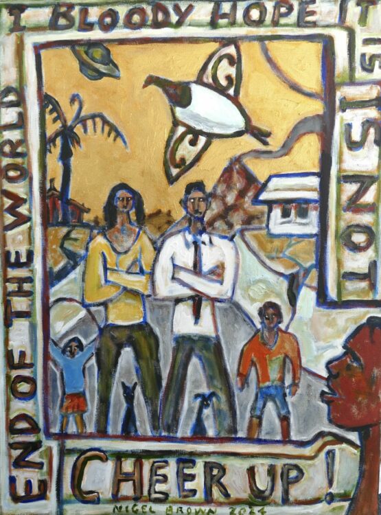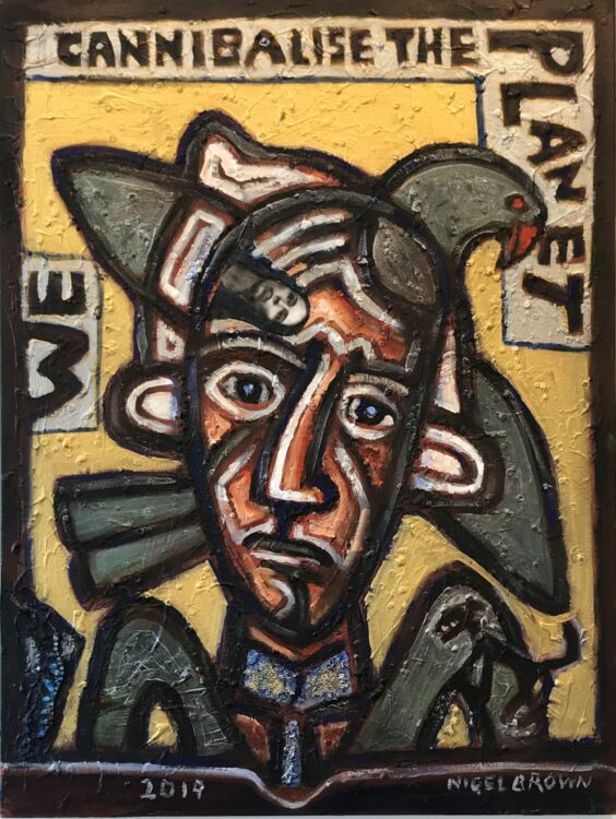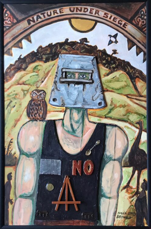 Nigel Brown was a founding member of VAANA – Visual Artists against Nuclear Arms – and with the strong connection his art made with New Zealanders, he used it to challenge views on social and environmental issues. He continues to use his paintings as a vehicle to challenge ideas about the environment, and about the way we connect with each other. Nigel Brown challenges the viewer to think harder about notions of identity, history, and also about conservation and social issues. His sharp-edged, often ironic humour engages the viewer before he delivers the challenge, but he is well aware there is more than one side to every argument, and leaves room for interpretation and cogitation.