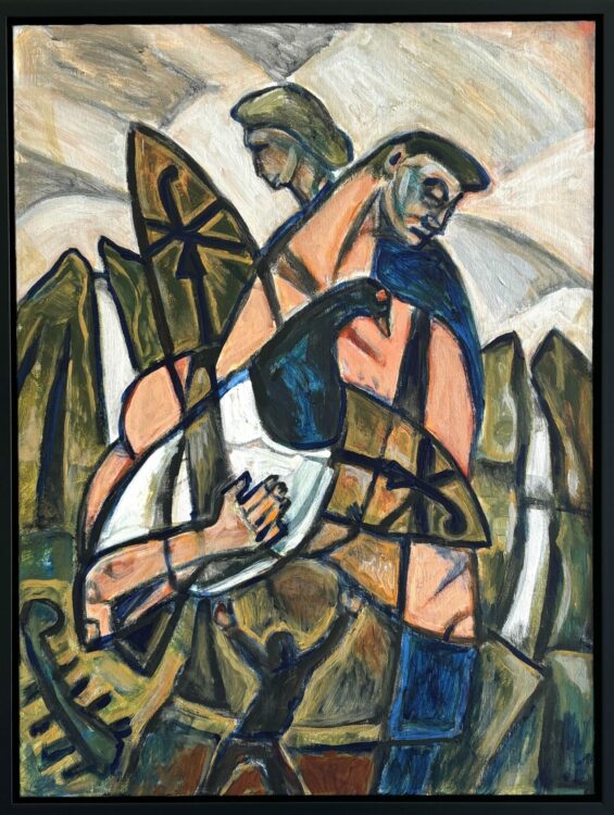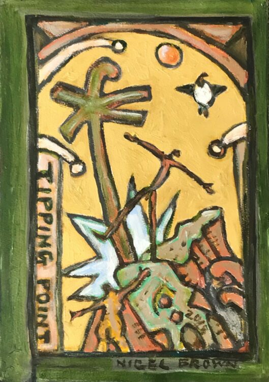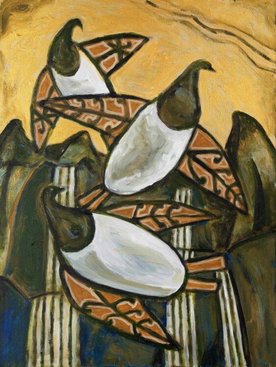 His Climate of Change series often uses his motif of the ‘black singlet man’ or Joe Taihape, but now with head bent in a pose of passive care, nurturing the land and the birds within it, a symbol of how humankind, as the users (sometimes abusers) of the land, must now become its nurturers.