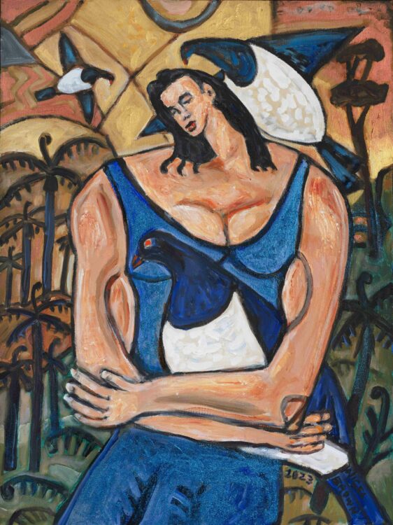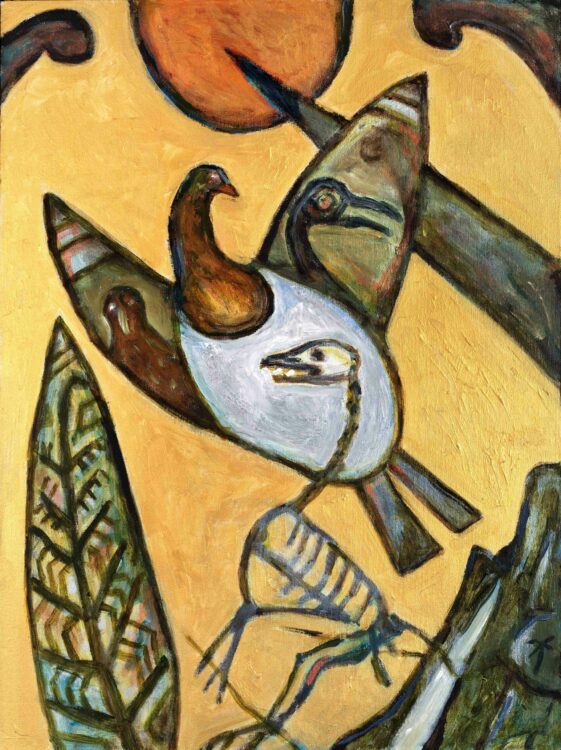 Born in 1949, Nigel Brown is widely acknowledged as one of our most important figurative artists and most significant narrative painter. He lived in the North Island for many years before returning to the southernmost coast of the South Island with partner Sue McLaughlin in 2001, then to Dunedin in 2016. He graduated from Elam School of Fine Arts in Auckland in 1971, has exhibited nationally and internationally, and his works are held in important public and private collections including several in the National Collection at Te Papa, the Museum of New Zealand. Nigel Brown has received three Queen Elizabeth II Art Council grants, and been awarded the Order of New Zealand Merit. While viewers often respond to his content or intent, his distinctive style and handling of paint are part of the cut-through and reality of his message. Many works bring into question the way we live – issues of sustainability, and of finding intuitive rather than strictly scientific solutions – with his sharply ironic humour underpinning the delivery of his ideas. Among Brown’s best-known works are paintings challenging the notion of the ‘New Zealand man’, the ‘real Kiwi’, staunch in the black singlet, man of the land, arms folded, uncompromising. A period in Russia on an arts residency reinforced his interest in ‘icons’ of our identity – such as the New Zealand man, Captain Cook – but also of icons of our environment – the birds, the ponga as tree of life, the landforms – and legendary figures like the poet James K Baxter or Brown’s own motif, the man-woman couple. His recent works focus very strongly on living sustainably in the landscape, especially the intuitive way birds live, as opposed to the scientific classification of the world exemplified through Cook. He uses the kererū in an emblematic way much as artists in ancient cultures did, viewing the world through the eyes of the creature; he tells stories of a ‘Climate of Change’ – socially and environmentally. ‘I have wanted to get closer to kererū, not in the sense of zoom lenses and fine details, but in a more ancient, psychic and emblematic sense’.