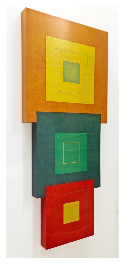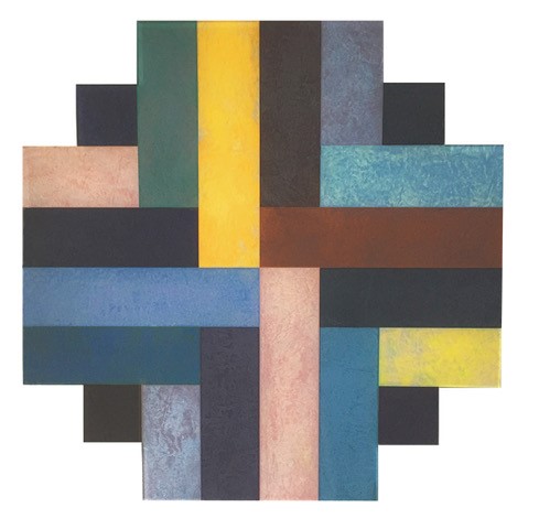 Roy Good’s abstract paintings are minimalist in form, but carry a sublime painterly subtlety when viewed at close hand. Within panels of each work, the colours are intensely worked, although the surface is often pared back so that from a distance it appears smooth. His use of colours creates planes which appear to advance and retreat against each other, although sometimes it is physical rather than illusion – he layers geometric forms so they literally project from the wall.