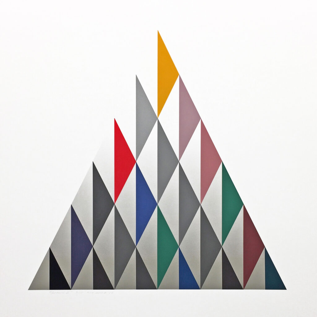 His forms are precisely determined, but within them the colour is applied instinctively, so that planes of colour appear to float or hover under and over each other. Close viewing reveals myriad colour exquisitely applied to further enhance the illusion of space.
