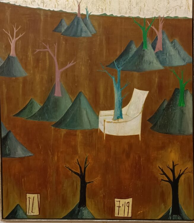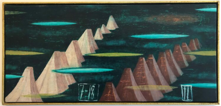Tony Lane’s recent works emerge from a series ‘Between Heaven and Earth’ which hover between surrealism and a sense of renaissance painting. These paintings link to the New Zealand landscape, the ever present mountains – with perhaps an influence from his early teacher, McCahon – and ideas about our environment, surroundings, in both a physical and metaphorical sense. We cannot connect with this ancient landscape without considering the contemporary issue of climate change, and the need to nurture the forests, the environment.