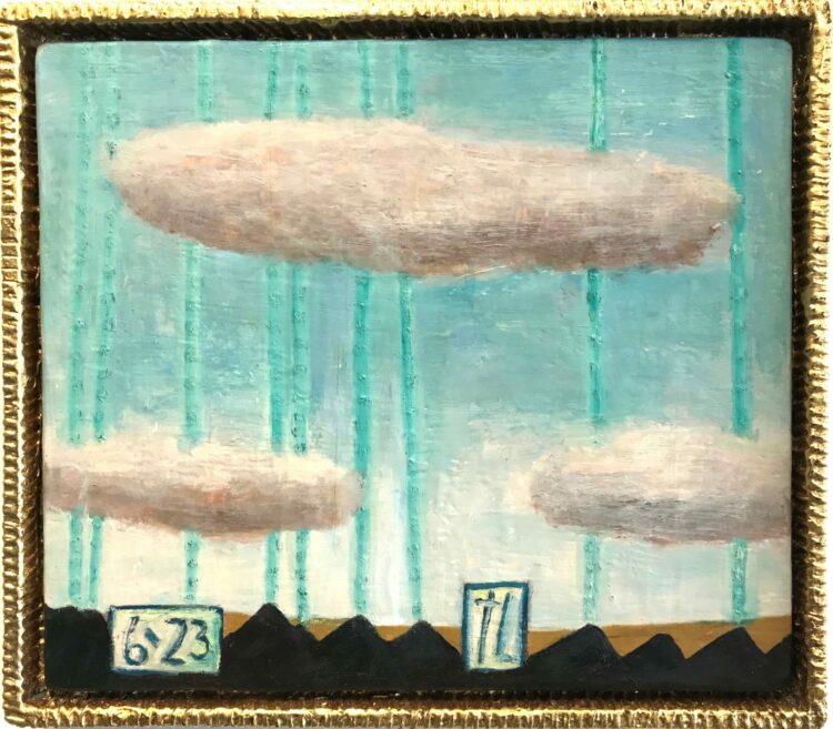 The mountains connect to the heavens and clouds – the physical to the spiritual – through familiar painterly devices such as strings which could be beads, tears, rain, or some other channel of connection; or haloes of cloud.