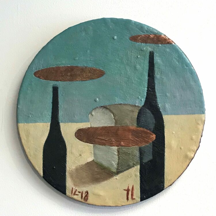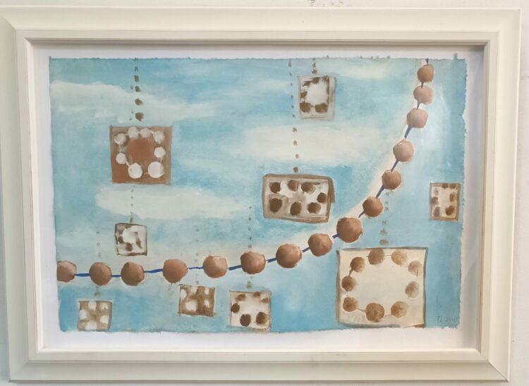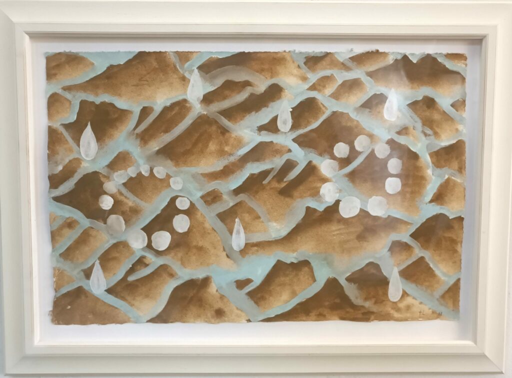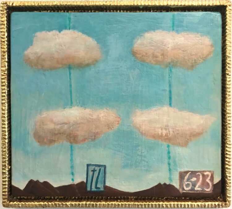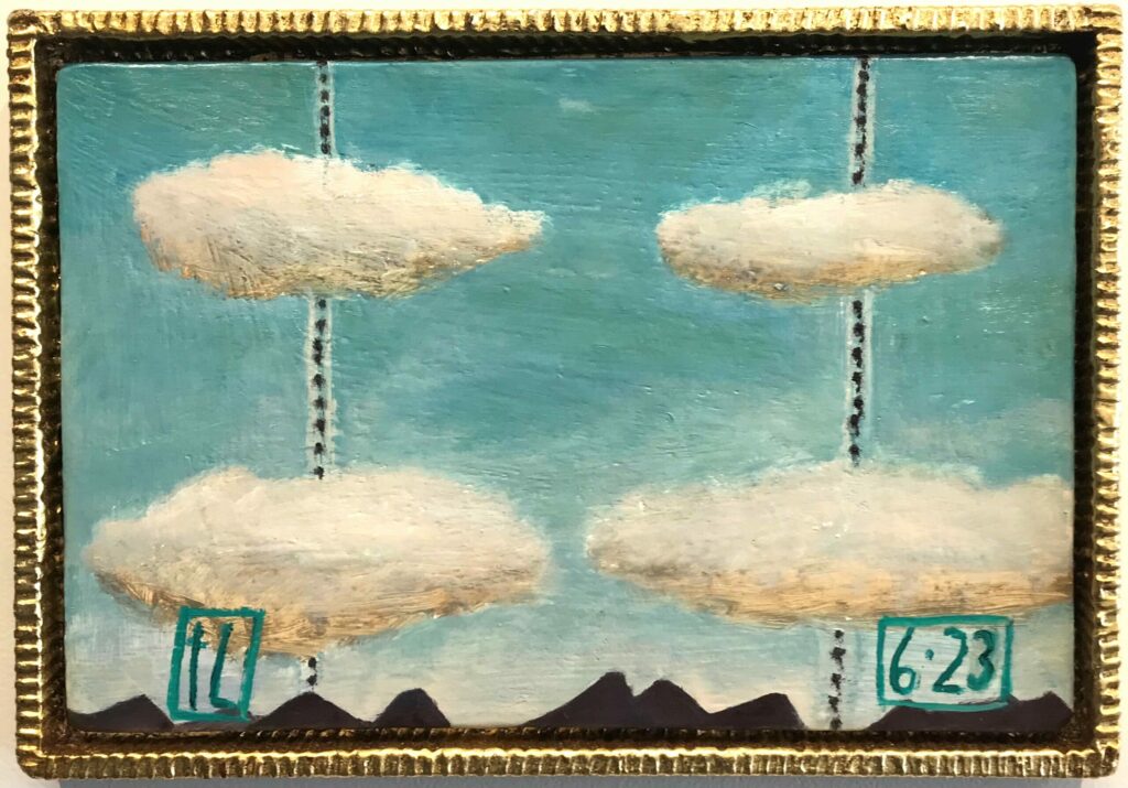 They present a kind of ‘still’ life, with space for meditation on our own connections, and consequences. And perhaps the clouds, more present in the new small paintings, are gathering, providing a space to contemplate the future?