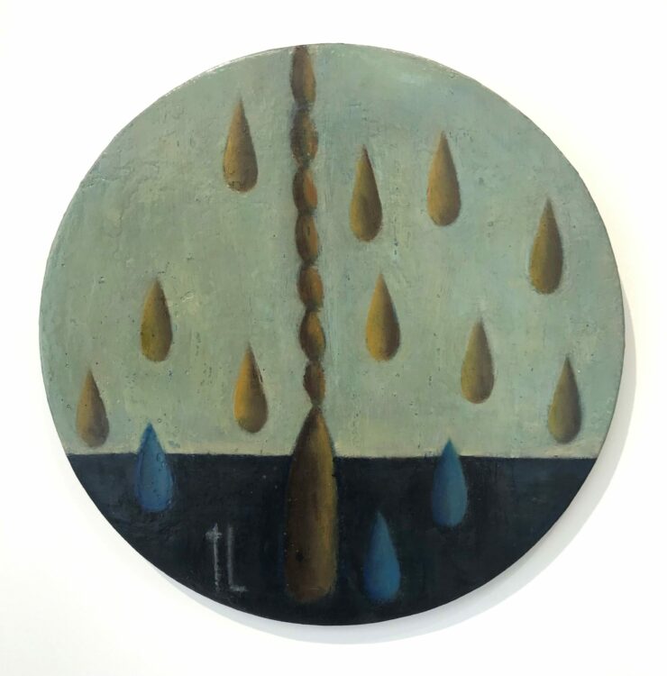 New Zealand artist Tony Lane uses iconographic symbols such as necklaces, trees, chairs, veils, and more recently cloud forms carrying a sense of the spiritual and the indefinable, yet anchored to the earth. Or weeping? A chair might stand in for a human presence, while his mountain forms and water suggest the physical world, but Lane prefers not to fix interpretation in place by offering a narrative.