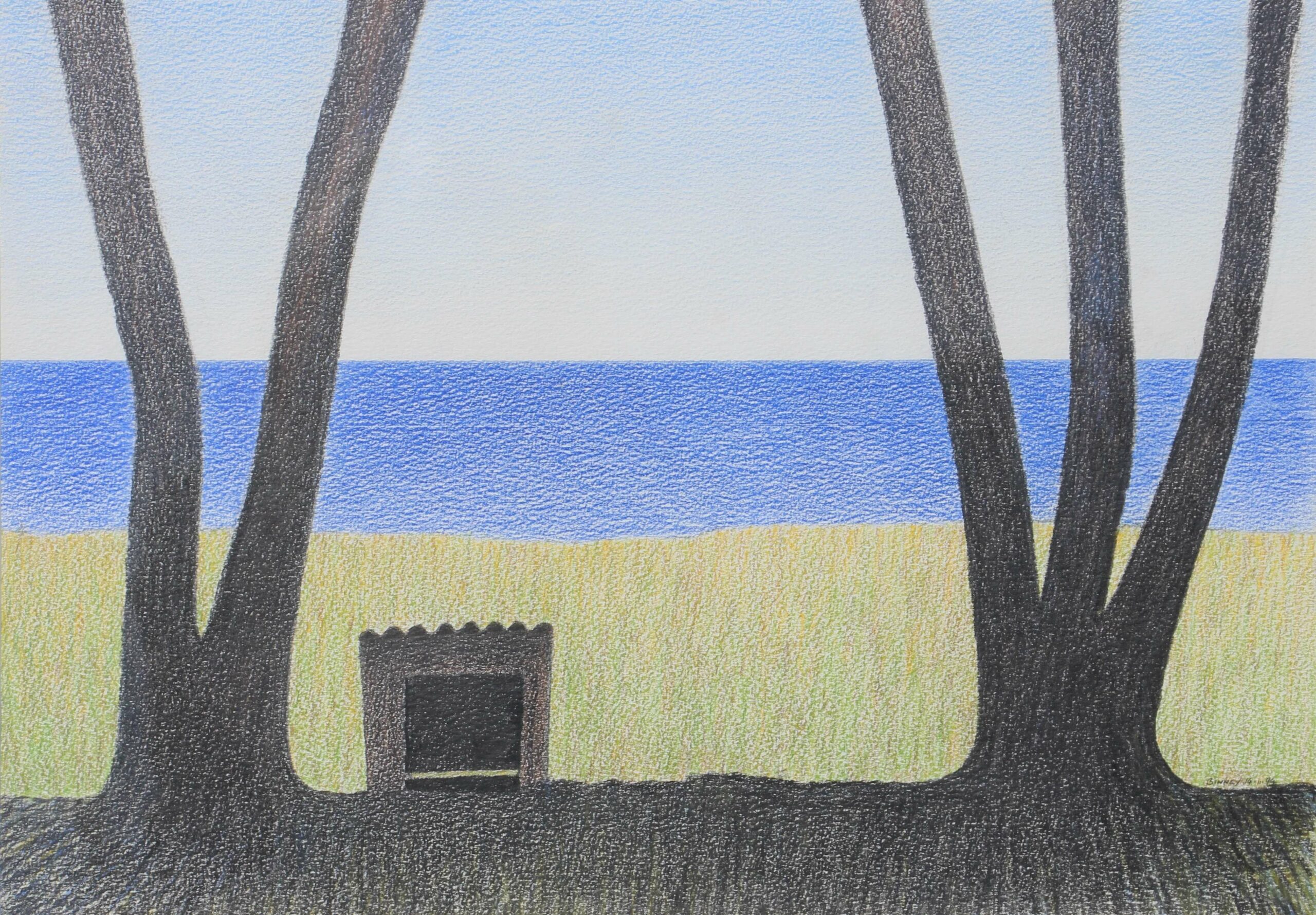 The kennel on the shoreline beneath distinctive pohutukawa trees at Hauturu – Little Barrier Island bird sanctuary – was an unusual ‘stand-in’ for the birds. The only dog allowed on the island was to help the ranger and sanctuary workers locate the birds. Don Binney was patron of the Hauturu Supporter’s Trust for many years.