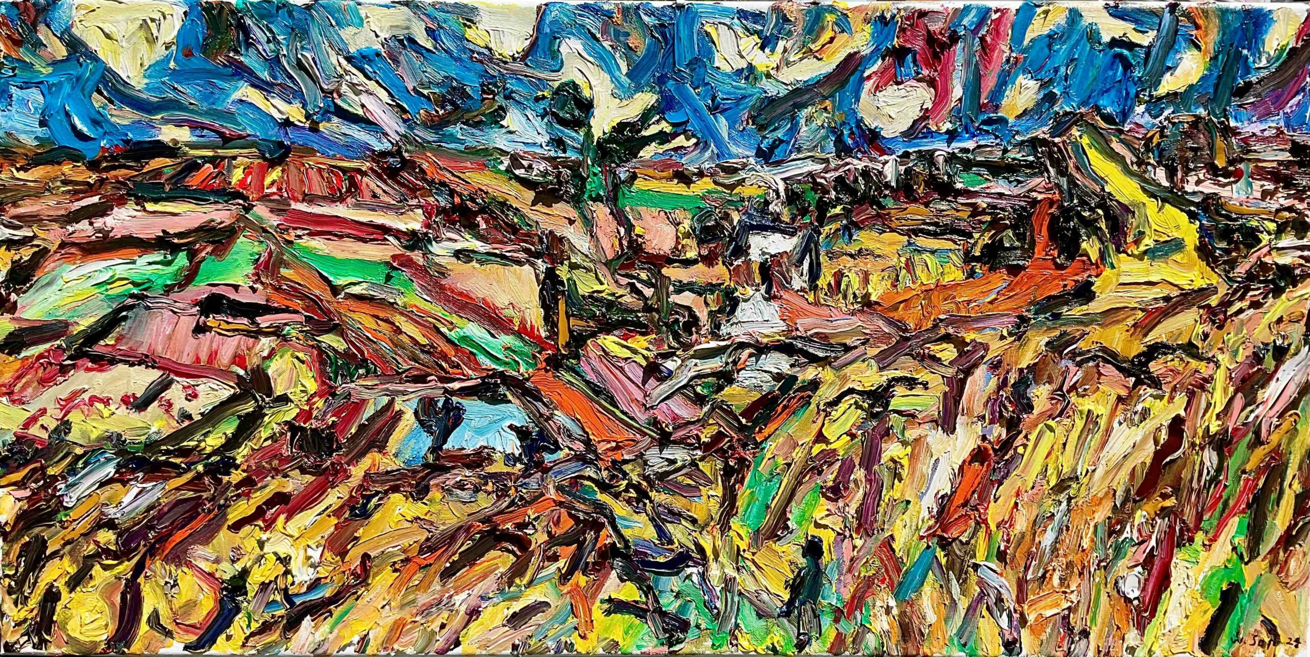 The painting is something of a homage to Van Gogh, one of Seyb’s artistic heroes. Drawings were reputedly found in Van Gogh’s pocket when he died, and Seyb decided to work from two of these images, rendering the drawings into paint, as a tribute to Vincent.
