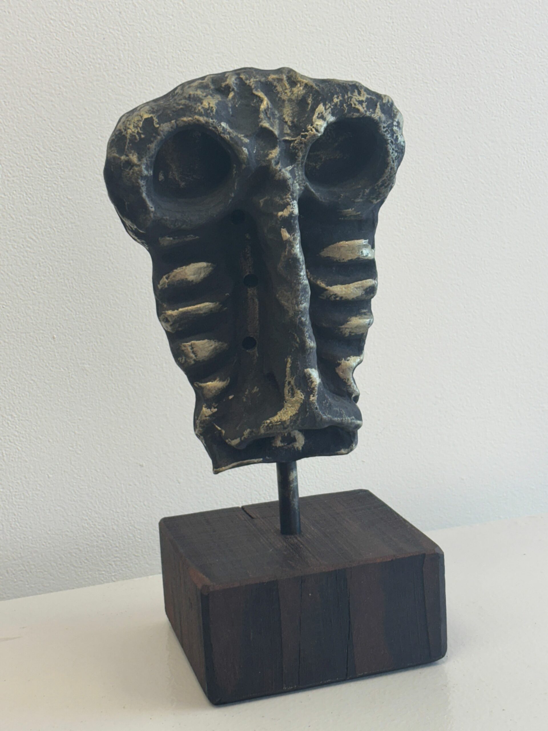 cast aluminium mask, 1/3, wood base