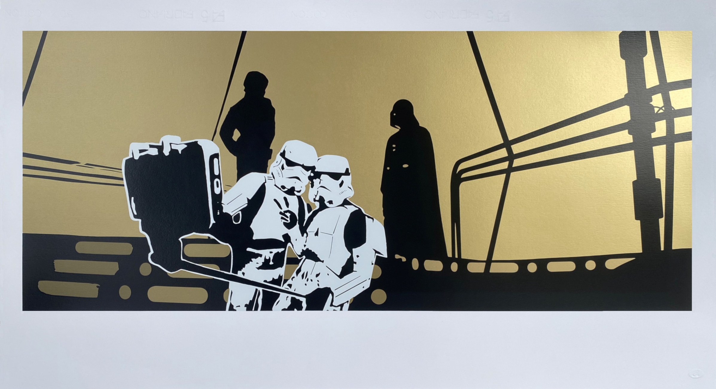 A rare metallic gold edition of Novak’s depiction of the Stormtroopers focused on taking their selfie, oblivious to the most momentous event in the Star Wars series takes place behind them.