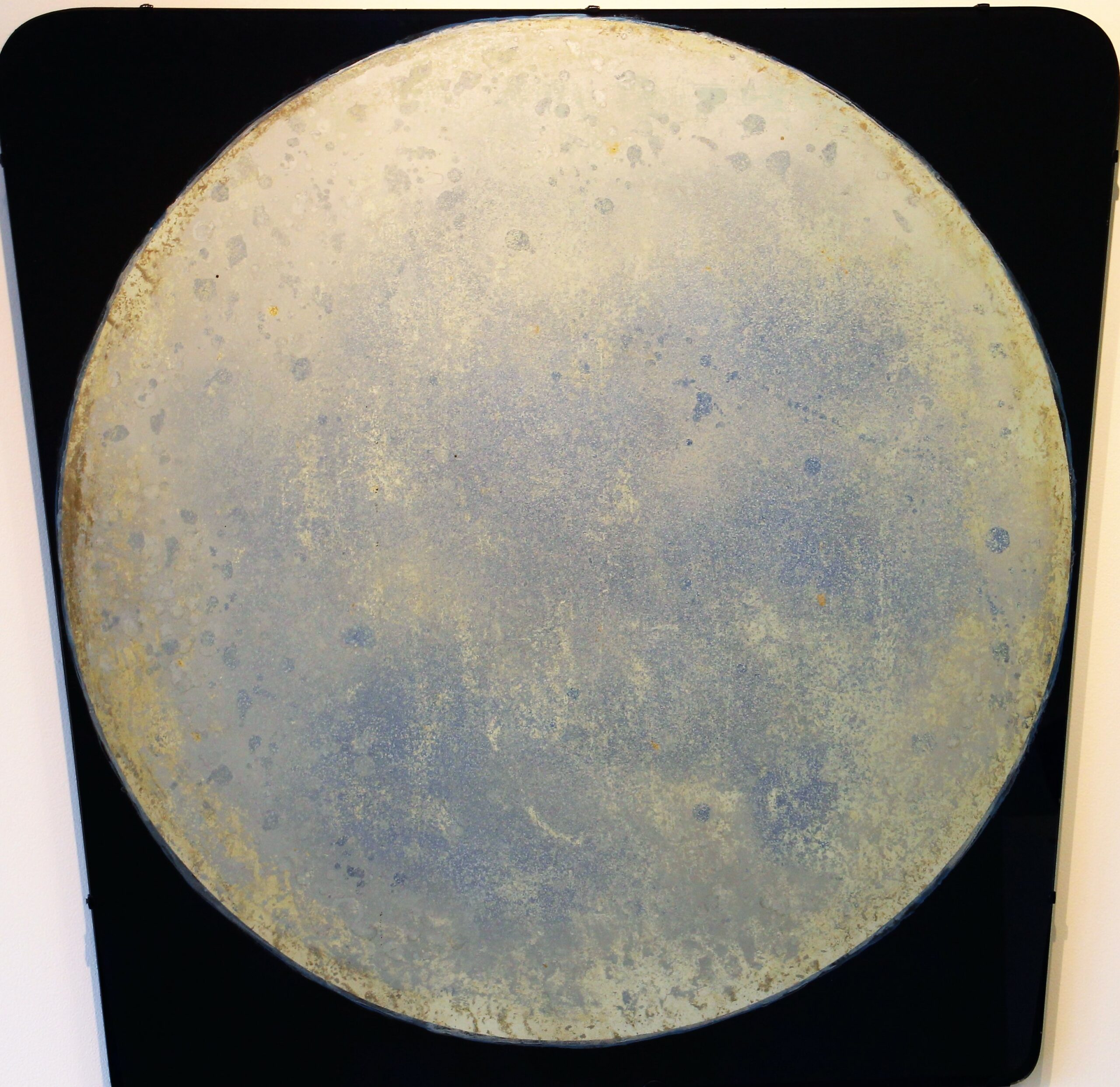 This exhibition includes mysterious mirror works by Mary McFarlane – shifting from her familiar Moon series to focus on Venus, whose transit brought Cook to the South Pacific, and guided other explorers. The orb seems to push out of the frame, with a halo of soft blue which becomes dazzling in the smaller work. Squall, Meretoto takes a more direct approach – the patterning the result of placing the treated mirror out in a fierce rainstorm for a short time, capturing the natural pounding of nature within the silvering.