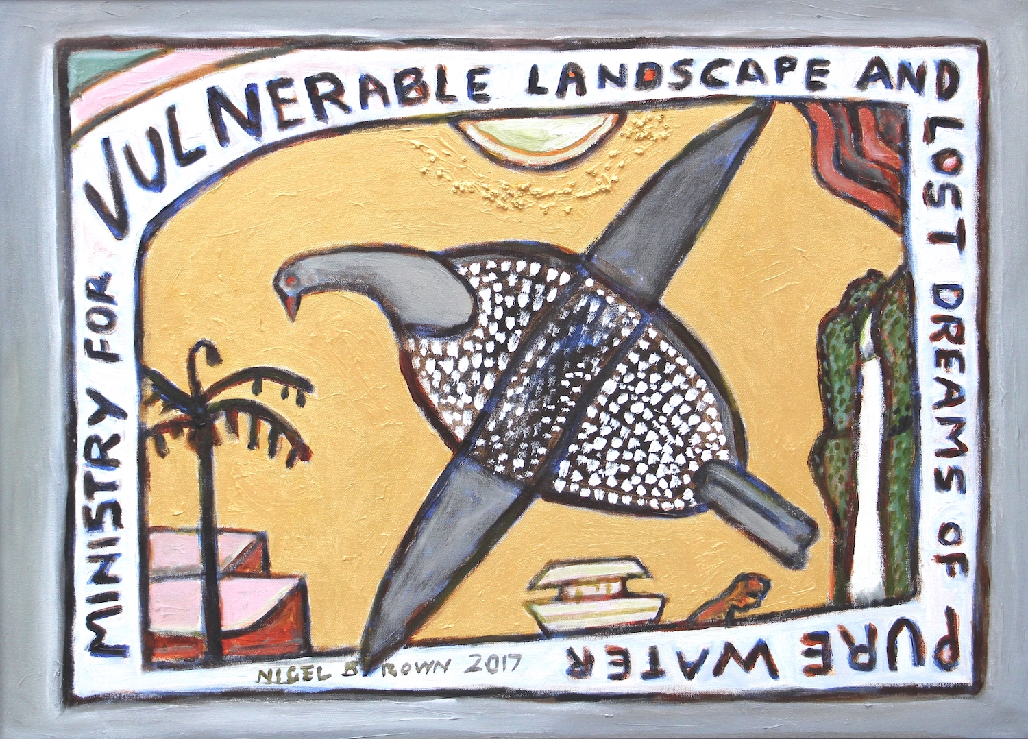 He confronts familiar issues that cannot be ignored – restoring our relationship with nature; issues of pure water versus commercial imperatives, social and cultural questions: this is indeed a ‘climate of change’. Increasingly textured paintings – employing acrylic, with shimmering gold over beads – capture multiple stories within his distinctive motifs and all his trademark ironic fierceness.