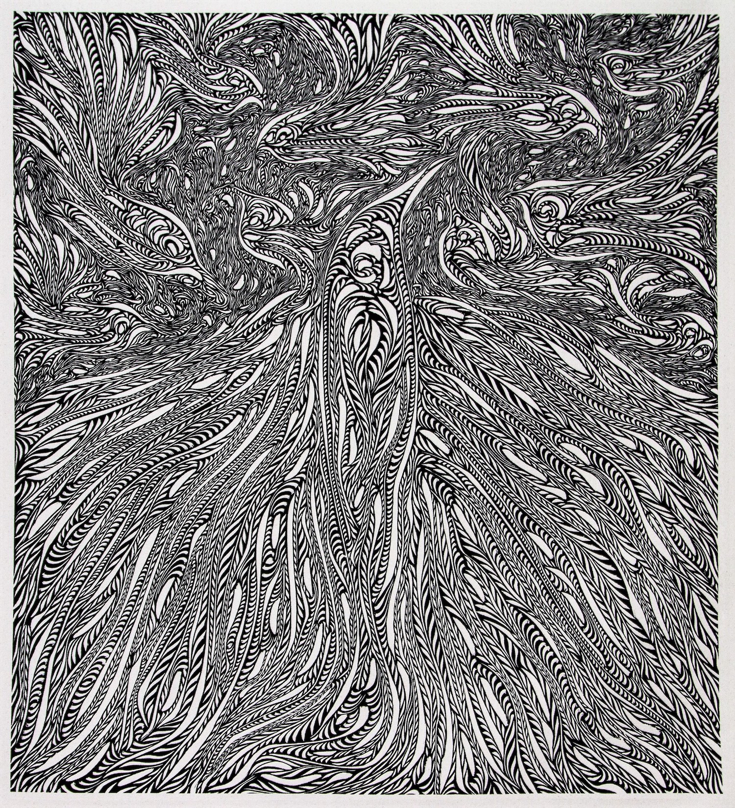 Regeneration of body, soul, family and nature surge through the new work of Canterbury artist Josh Bashford, evolving his distinctive, intricate woodcuts on canvas to a new level. It was a year of new generations amongst his family, and in the environment in the Little River area, which Bashford has embraced in his incredibly detailed woodcuts. Teeming with birdlife, and motifs of new generations, nurtured, swirling, joyous; they reflect a young artist moving into a new period of confident art practice.
